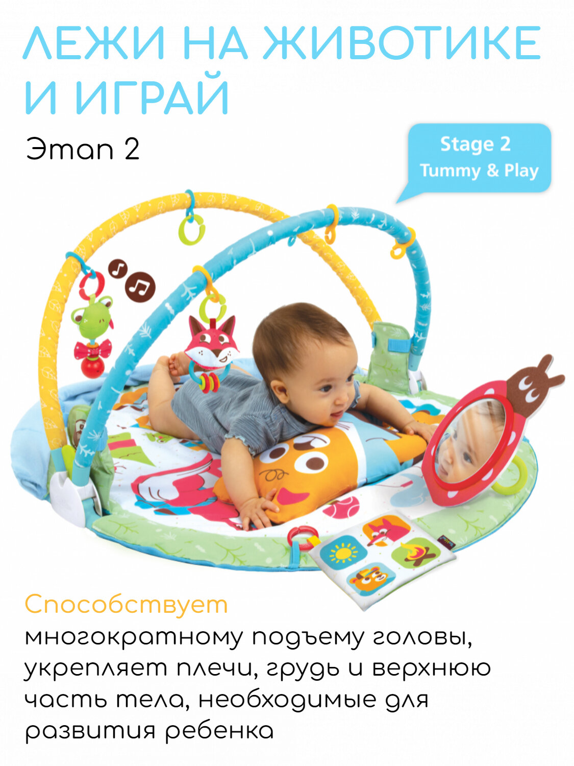 Этап 2: Лежи на животике и играй: способствует многократному подъему головы, укрепляет плечи, грудь и верхнюю часть тела, необходимые для развития ребенка. Способствует координации глаз и рук и развивает мелкую моторику.