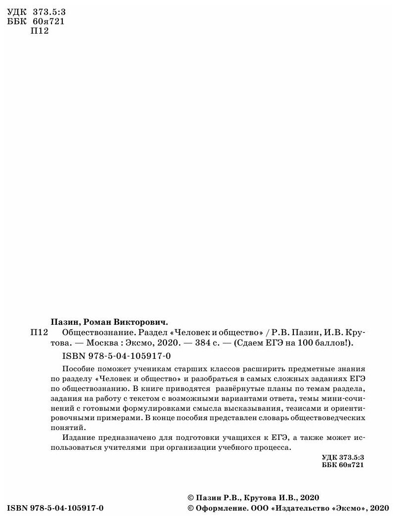 Обществознание. Раздел «Человек и общество» (Пазин Роман Викторович, Крутова Ирина Владимировна); ООО "Издательство "Эксмо", 2020