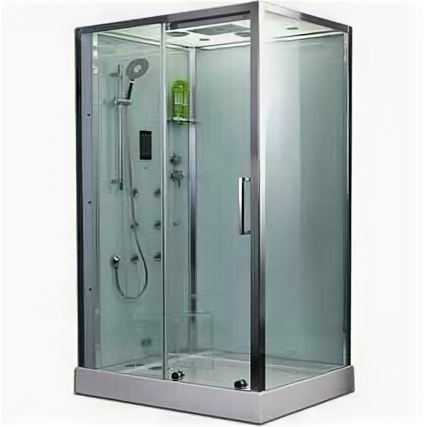 1200х900х2200 мм. Акриловый поддон высотой 15см с усиленным каркасом и сифоном. LED-хромотерапия - 7 цветов. Сенсорный пульт управления. Fm - радио. Подключение к CD. Подключение к телефону. Турецкая баня. Фитотерапия. Гидромассаж спины 6 джет. Стеклянная крыша. Лейка. Однорычажный смеситель. Стеклянные задние стенки белого оттенка толщина 6 мм., Распашная дверь толщина 8 мм. Хромированные петли из нержавеющей стали. Стеклянная полочка. Ручка."