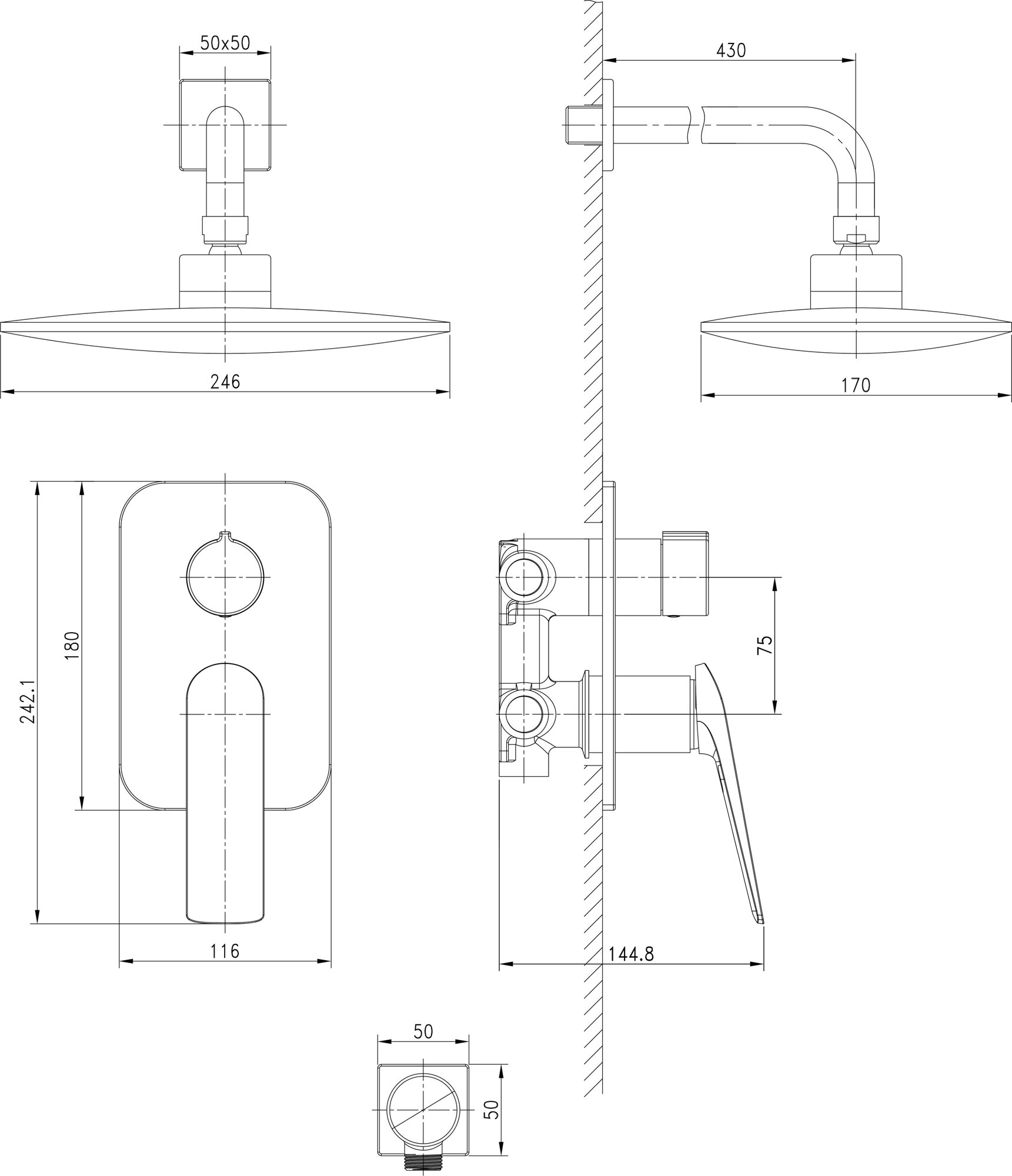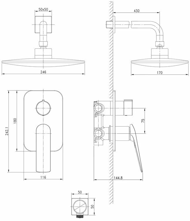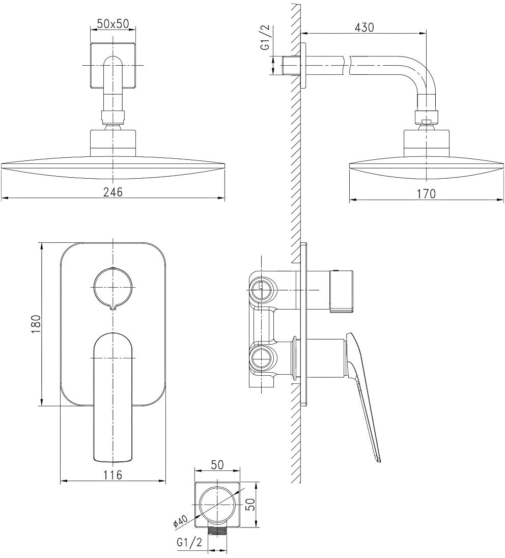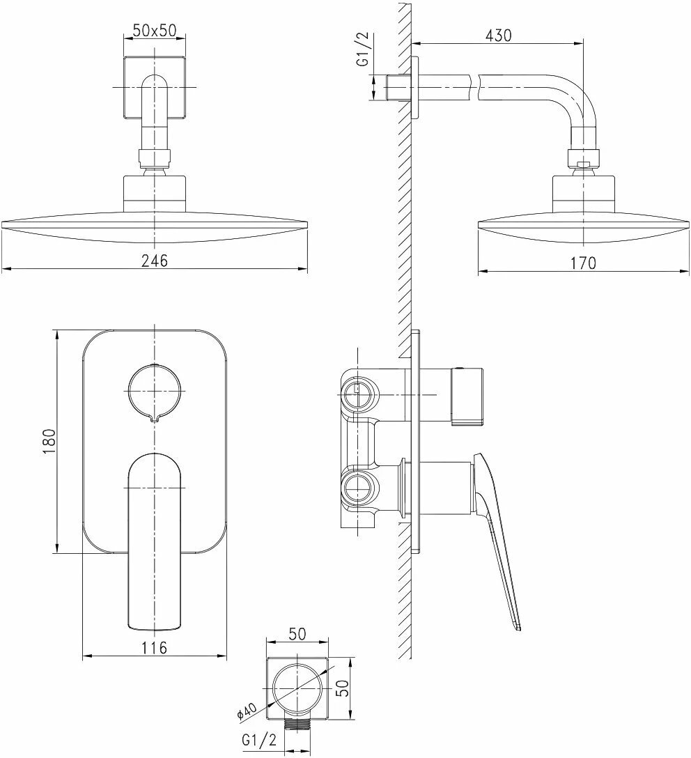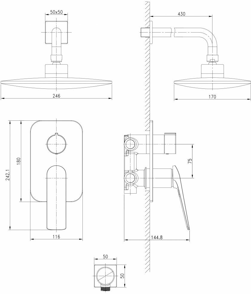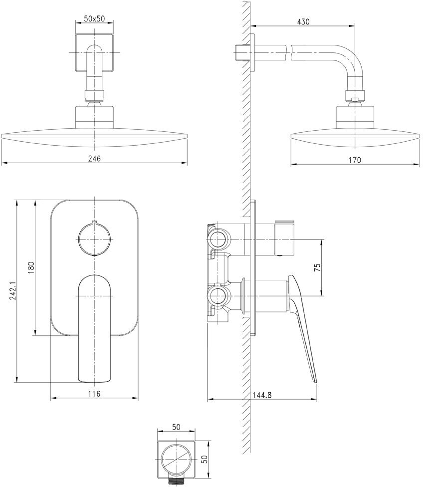 | ВКоробке | Верхний душ - 1 шт. Кронштейн для верхнего душа - 1 шт. Лейка - 1 шт. Шланг - 1 шт. Настенный держатель - 1 шт. Смеситель - 1 шт. Внутренняя монтажная часть - 1 шт. Шланговое подключение -1 шт. Инструкция - 1 шт. |
