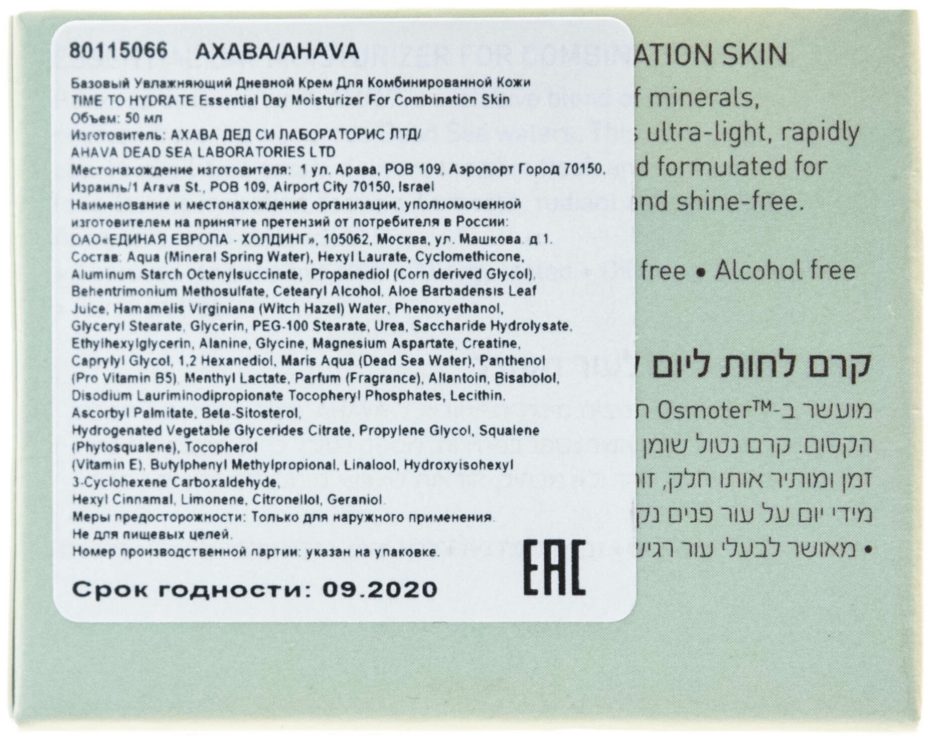 Состав: Aqua (Mineral Spring Water), Hexyldecyl Laurate, Cyclomethicone, Behentrimonium Methosulfate & Cetearyl Alcohol, Aluminum Starch Octenylsuccinate,Propanediol (Corn derived Glycol), Alanine & Creatine & Glycerin & Glycine & Magnesium Aspartate & Saccharide Hydrolysate & Urea, Aloe Barbadensis Leaf Juice, Glyceryl Stearate & PEG-100 Stearate, Hamamelis Virginiana (Witch Hazel) Flower Water, Caprylyl Glycol & 1,2 Hexanediol, Maris Sal (Dead Sea Water), Panthenol (Pro Vitamin B5) , Menthyl Lactate, Parfum (Fragrance), Iodopropynyl Butylcarbamate & Methylisothiazolinone & Aqua, Allantoin, Bisabolol, Disodium auriminodipropionate Tocopheryl Phospates, Lecithin & Propylene Glycol & Squalene (Phytosqualene) & Tocopherol (Vitamin E) & Beta-Sitosterol & Ascorbyl Palmitate & Hydrogenated Vegetable Glycerides Citrate, Alpha Isomethyl Ionone, Benzyl Alcohol, Benzyl Benzoate, Butylphenyl Methylpropional, Citral, Citronellol, Geraniol, Hexyl Cinnamal, Hydroxyisohexyl 3-Cyclohexene Carboxaldehyde, Limonene, Linalool.