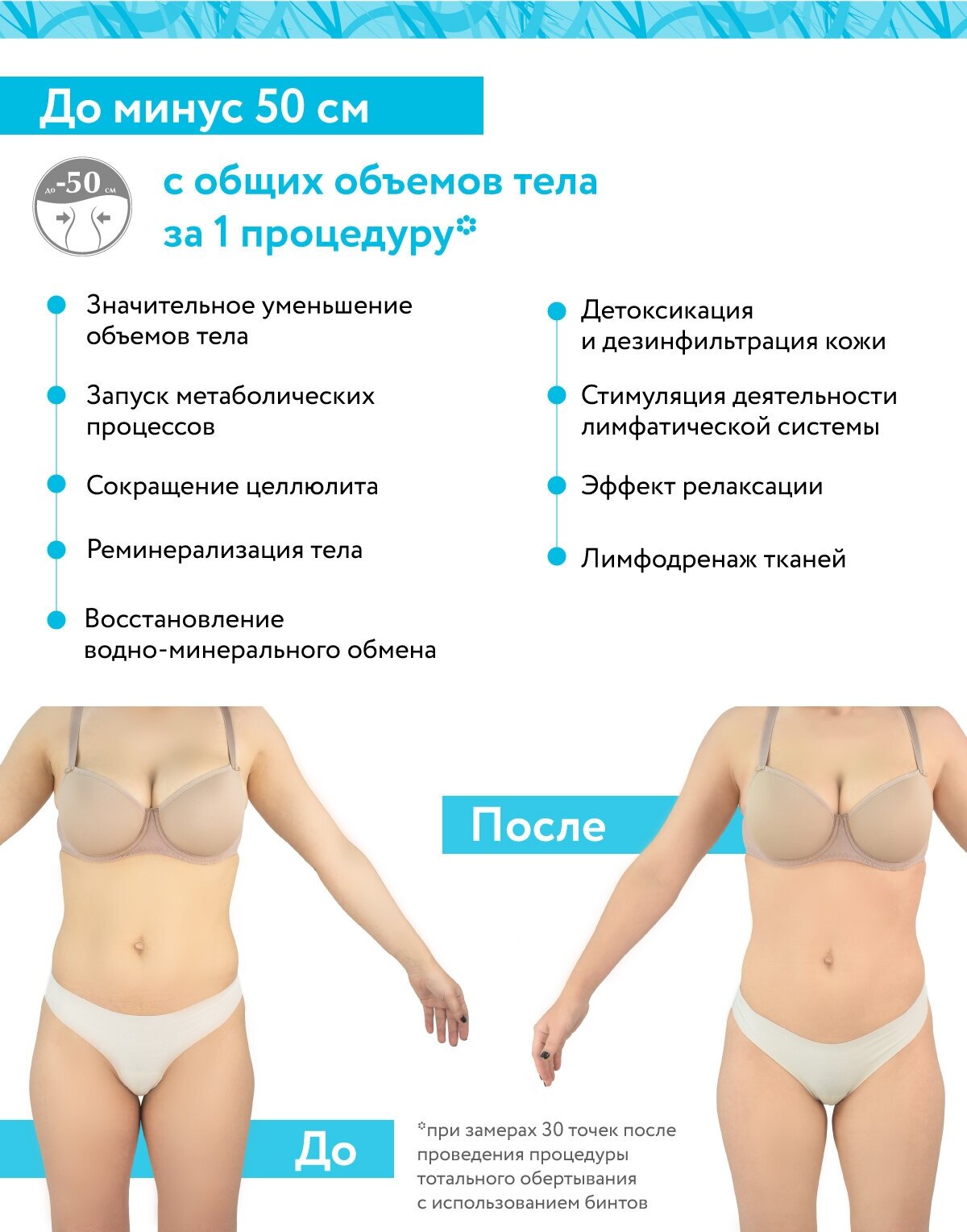 Хороший состав у обертывания. Использую в комплексе: скраб солевой, гель, бинты (пропитанные солью из этой же серии). По эффекту: гладкость, подтянутость. А а счёт этого визуально уменьшается объём.