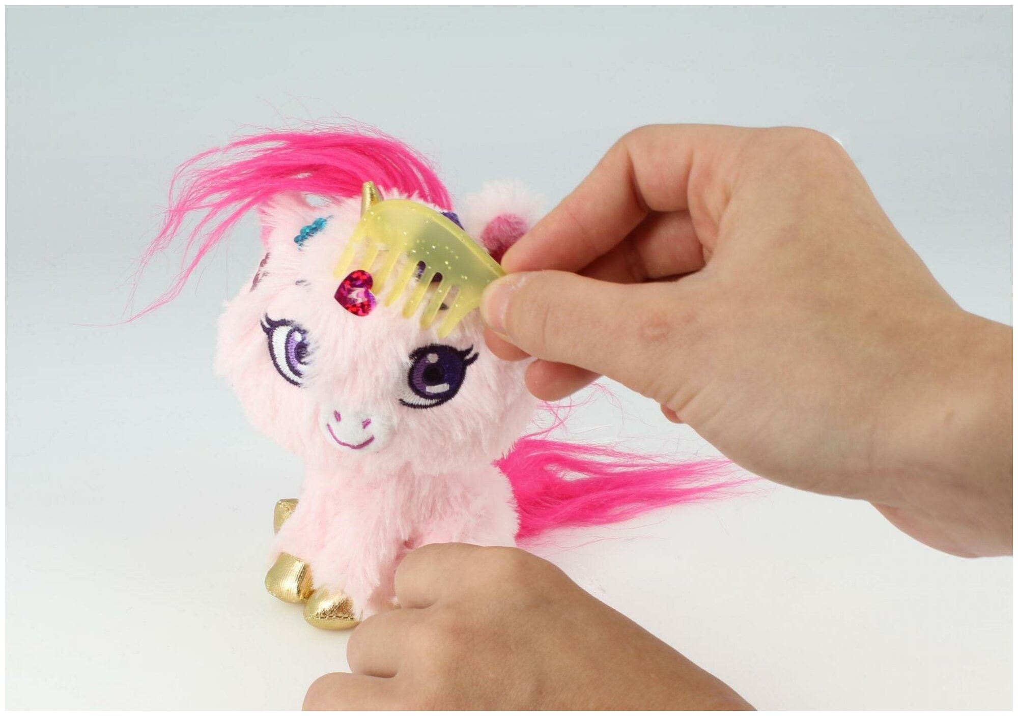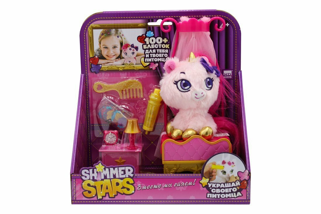 Комплект: плюшевый единорог 13 см, шиммерайзер (аксессуар для нанесения и хранения блесток), 100+ блесток, расческа, кроватка с балдахином, столик для нанесения блесток, аксессуары.