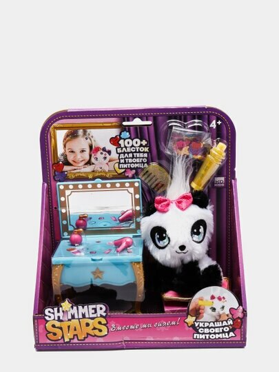 Панда Пикси открыла звездный салон красоты. Теперь любой может выглядеть блестяще! Для этого в наборе есть шиммерайзер, с помощью которого панда украшает себя блестками. В комплекте удобный столик с зеркалом, где можно создать настоящий звездный образ!