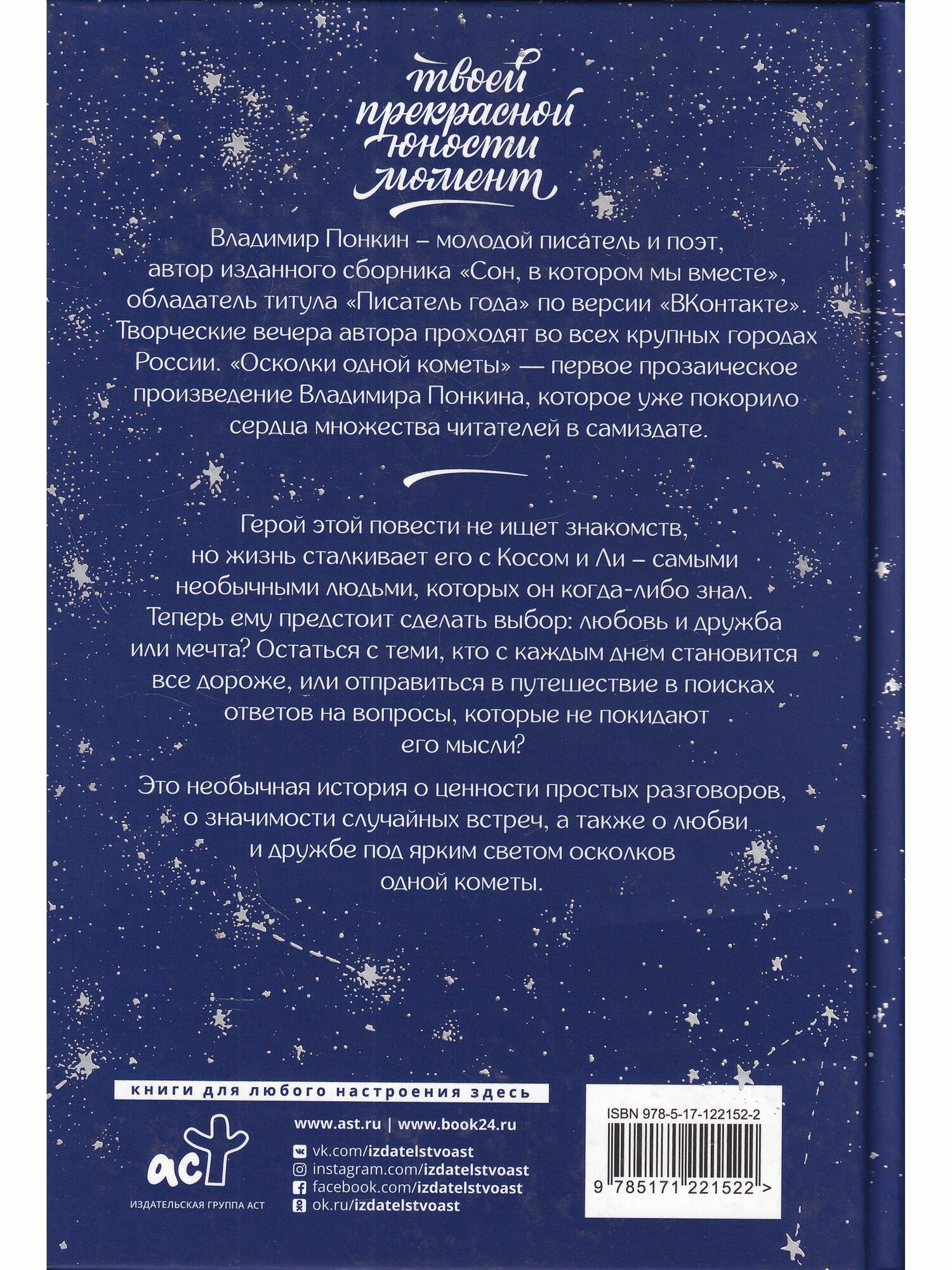Владимир Понкин – молодой писатель и поэт, автор изданного сборника "Сон, в котором мы вместе", обладатель титула "Писатель года" по версии "ВКонтакте". Творческие вечера автора проходят во всех крупных городах России. "Осколки одной кометы" – первое прозаическое произведение Владимира Понкина, которое уже покорило сердца множества читателей в самиздате.