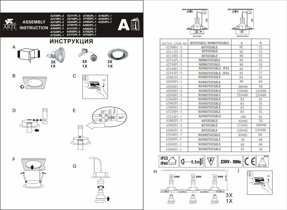 | Максимальная допустимая мощность лампы (Вт) | 50 |
