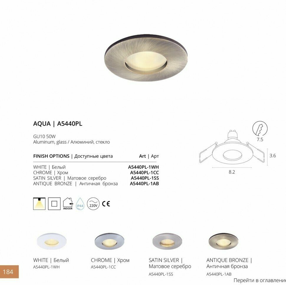 Встраиваемый светильник влагозащищенный Aqua - продукт известной компании Artelamp (Италия). Имеет максимальную мощность 50 Вт, освещает площадь до 1 кв. м. Отлично подойдет для таких мест, как ванная. Впишется в интерьеры следующих стилей: классический.