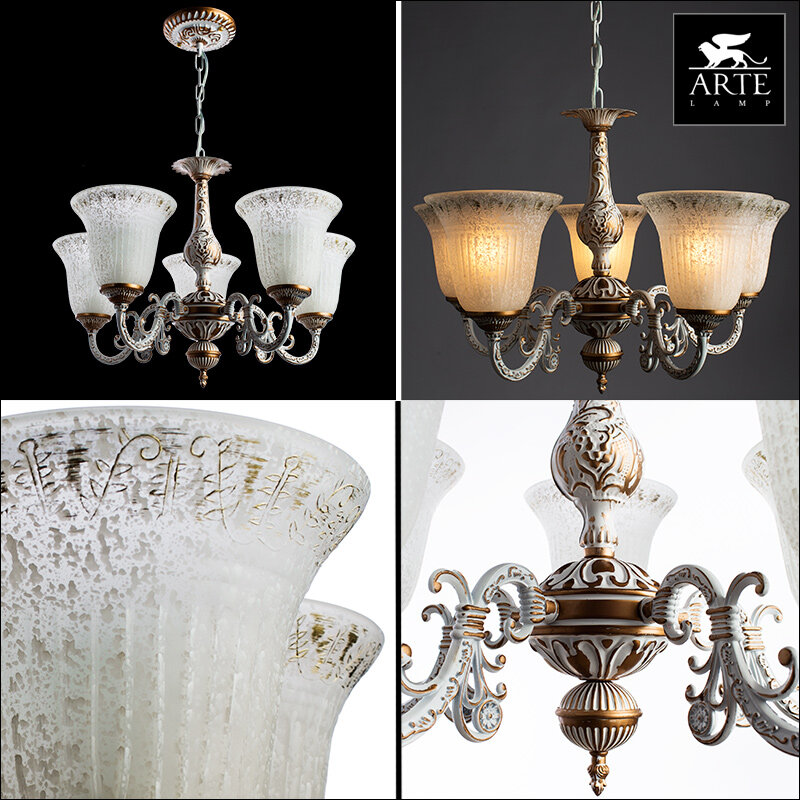 Artelamp Подвесной светильник ARTE LAMP коллекции DELIZIA бело-золотого цвета предназначен для внутреннего освещения жилых и общественных помещений. Его металлическая конструкция выполнена в классическом стиле, что придает привлекательный внешний вид, который, несомненно, впишется в любой интерьер. Источником света данной модели являются пять ламп мощностью по 60 Вт (приобретаются отдельно) с цоколем E27.