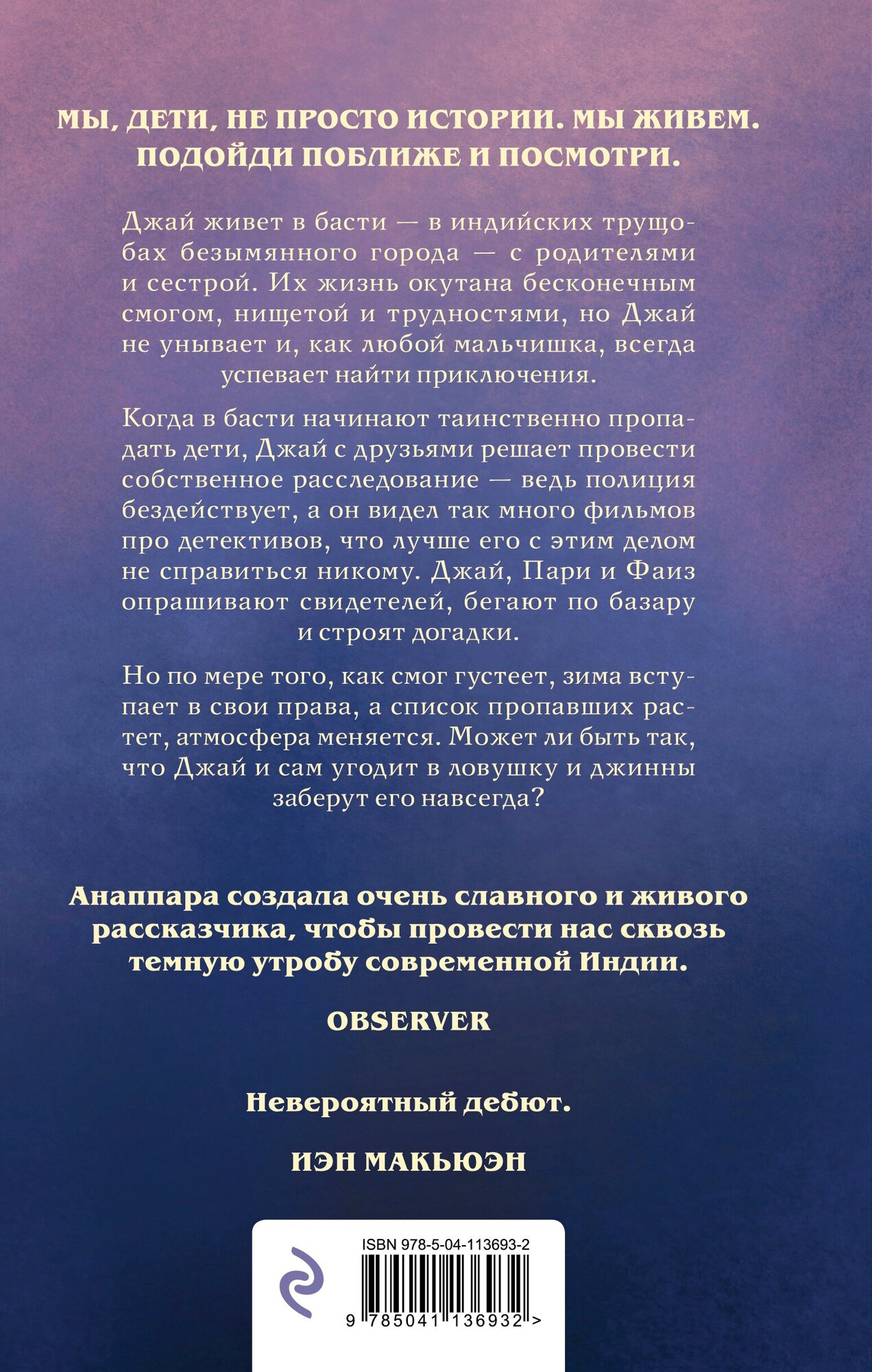 Джай живет в басти - в индийских трущобах безымянного города - с родителями и сестрой. Их жизнь окутана бесконечным смогом, нищетой и трудностями, но Джай не унывает и, как любой мальчишка, всегда успевает найти приключения. Когда в басти начинают таинственно пропадать дети, Джай с друзьями решают провести собственное расследование - ведь полиция бездействует, а он видел так много фильмов про детективов, что лучше него с этим делом не справиться никому. Джай, Пари и Фаиз опрашивают свидетелей, бегают по базару и строят догадки. Но по мере того как смог густеет, зима вступает в свои права, а список пропавших растет, атмосфера меняется. Может ли быть так, что Джай и сам угодит в ловушку, и джинны заберут его навсегда? Один из лучших дебютов 2020 года, этот роман выиграл несколько литературных премий и был переведен на 20 языков. Хроника современной Индии, показанная глазами ребенка из трущоб. «Патруль джиннов на Фиолетовой ветке» - многослойный роман: это трогательная история об украденном детстве, о мощной силе воображения, о страхах, о печальной поэзии утрат, это сатира на коррумпированную власть и расслоение общества, это остросоциальное высказывание, призывающее к действию. Написанная удивительным живым языком, с рассыпанными по всему тексту современными индийскими реалиями - запахами специй и нечистот, уличными торговцами, названиями незнакомых блюд, свалками, трущобами и современными дворцами, - эта книга искусно балансирует на грани между комедией и трагедией. «Анаппара создала очень славного и живого рассказчика, чтобы провести нас сквозь темную утробу современной Индии». - Observer