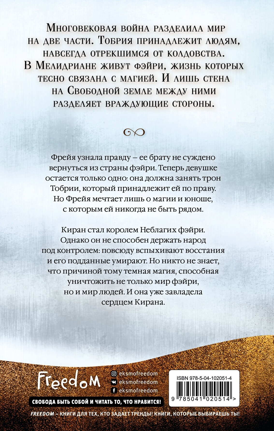 Многовековая война разделила мир на две части. Тобрия принадлежит людям, навсегда отрекшимся от колдовства. В Мелидриане живут фэйри, жизнь которых тесно связана с магией. И лишь стена на Свободной земле между ними разделяет враждующие стороны. Фрейя узнала правду - ее брату не суждено вернуться из страны фэйри. Теперь девушке остается только одно: она должна вернуться в Тобрию и занять трон, который принадлежит ей по праву. Но Фрейя мечтает лишь о магии и юноше, с которым ей никогда не суждено быть рядом. Киран стал королем Неблагих фэйри. Однако он не способен держать народ под контролем: повсюду вспыхивают восстания и его подданные умирают. Но никто не знает, что причиной тому темная магия, способная уничтожить не только мир фэйри, но мир людей. И она уже завладела сердцем Кирана.