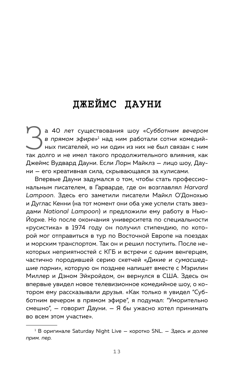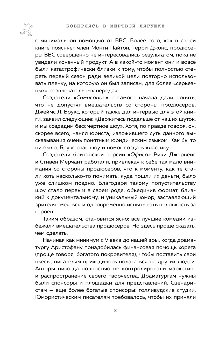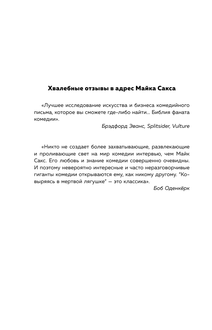 Автор этой книги Майк Сакс не пытается "разделать" комедию "до смерти", словно несчастную лягушку. Нет, он лишь осторожно проходится по всем ее составляющим, уважая это хрупкое искусство.