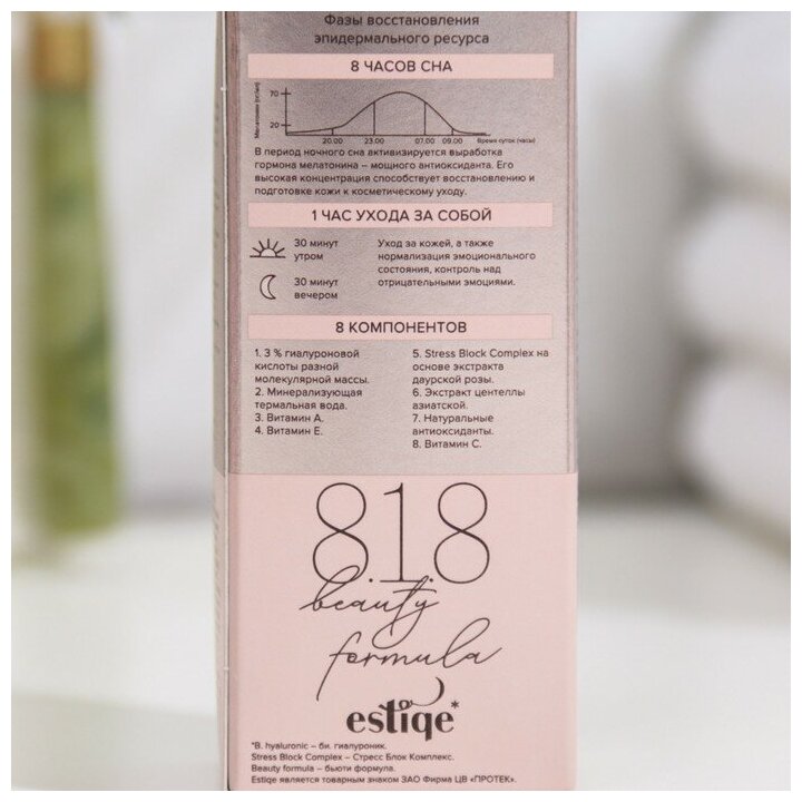 8.1.8 Beauty formula - трехфазная система профилактики и защиты кожи от стресса. Восстанавливает эпидермальный ресурс. Омолаживает кожу. Создана для чувствительной кожи женщин мегаполиса, испытывающих дефицит сна и отдыха.Гиалуроновяя сыворотка для глаз и ресниц оказывает мгновенное видимое омоложение кожи вокруг глаз. Обладает эффектом лифтинга, способствует сокращению морщин, а также восстановлению и укреплению ресниц. Защищает кожу от стресса. Обладает мгновенным и пролонгированным омолаживающим действием. Активно действующие компоненты: галуроновая кислота (низко, средне-и высокомолекулярная) в концентрации 3% уникальный Stress Block Complex, комплекс витаминов А, Е, С, антиоксиданты растительного и синтетического происхождения (Q10, сафлоровое масло), аминокислоты, церамиды, экстракт центеллы азиатской. Минерализующая вода из термального источника на юге Франции восстанавливает и успокаивает кожу.8.1.8 beauty formula сохраняет естественную красоту кожи. Активные компоненты: 3 вида гиалуроновой кислоты, церамиды, коэнзим Q10, аминокислоты, экстракт виноградных косточек, экстракт центеллы азиатской, Stress Block Complex, витамин A, витамин С, витамин Е, соевое масло, сафлоровое масло, термальная вода.