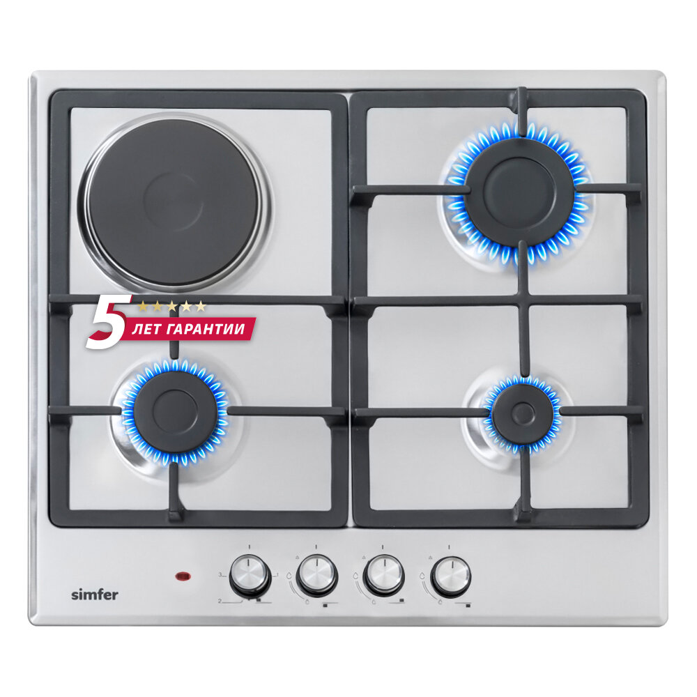 Комбинированная варочная панель Simfer , оснащенная 3 газовыми (с газ-контролем) и одной электрической конфорками - настоящая находка для любящих эксперименты людей, так как комбинирование источников тепла предоставляет довольно обширные возможности для всех хозяек, которые вынуждены или любят много готовить. Благодаря небольшим размерам и лаконичному дизайну эта модель впишется в интерьер любой кухни. Рабочая поверхность выполнена из нержавеющей стали – прочного и долговечного материала. Управление варочной панелью осуществляется посредством четырёх поворотных переключателей, в которые встроен электроподжиг, значительно упрощающий работу с панелью. Комбинированная варочная панель Simfer стильный и функциональный прибор, который поможет вам готовить самые разнообразные блюда!