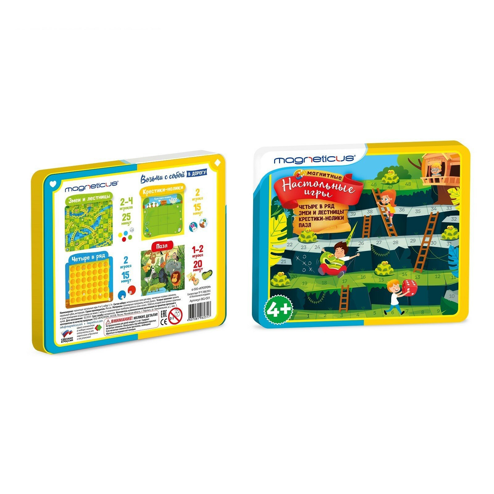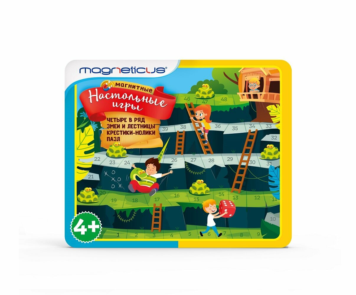 Игры рассчитаны на возраст от 4 лет, в наборе несколько полей, правила игры и магнитные элементы для следующих игр: змейки-лесенки, четыре в ряд, крестики-нолики, а также магнитный пазл.