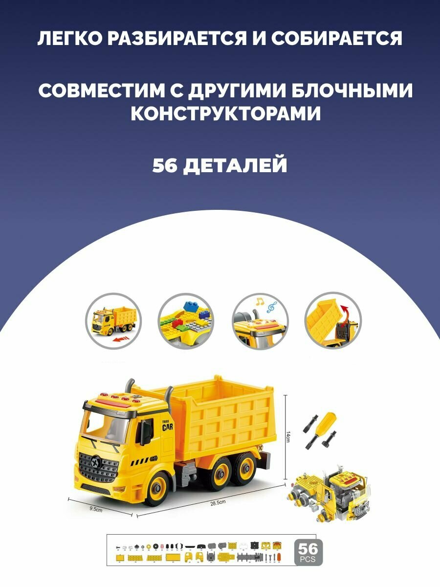 Функциональный конструктор в виде машины, подвижные детали, возможность сборки - разборки, отвертка в комплекте, совместим с блочными конструкторами, свет, звук.