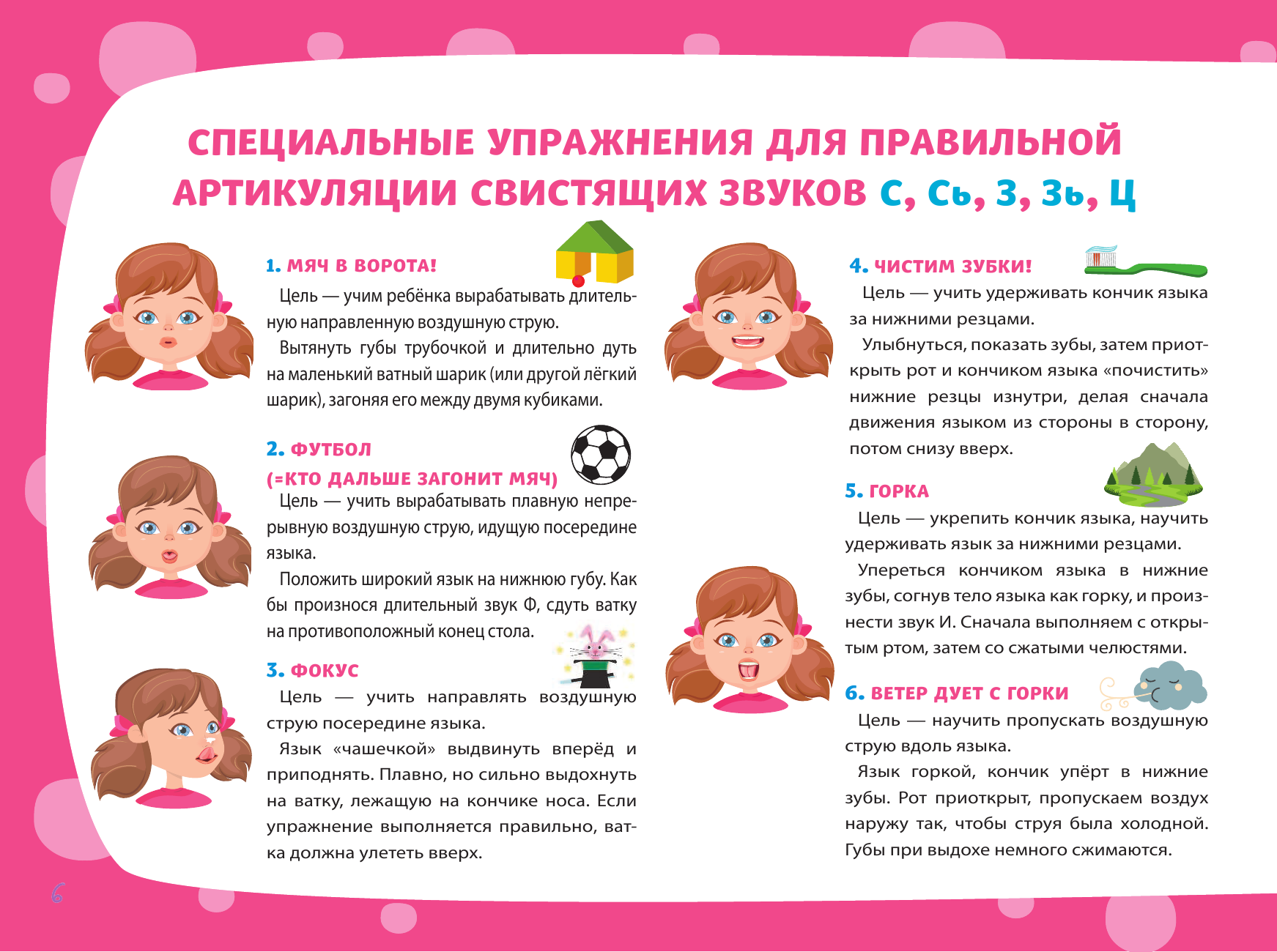 Например, если во время произнесения свистящих звуков кончик языка просовывается между верхними и нижними резцами – это межзубный сигматизм (в народе – шепелявость). При других видах сигматизма мы можем услышать в речи ребенка «фанки» или «танки» вместо «санки», «тапля» вместо «цапля», «дайка» вместо «зайка» и «донтик» вместо «зонтик», «шяхар» вместо «сахар», «жямок» вместо «замок»… Точно определить вид нарушения и поставить ребенку правильные свистящие звуки может специалист-логопед. А автоматизацией поставленных звуков вы можете с успехом заниматься, используя этот логопедический альбом.