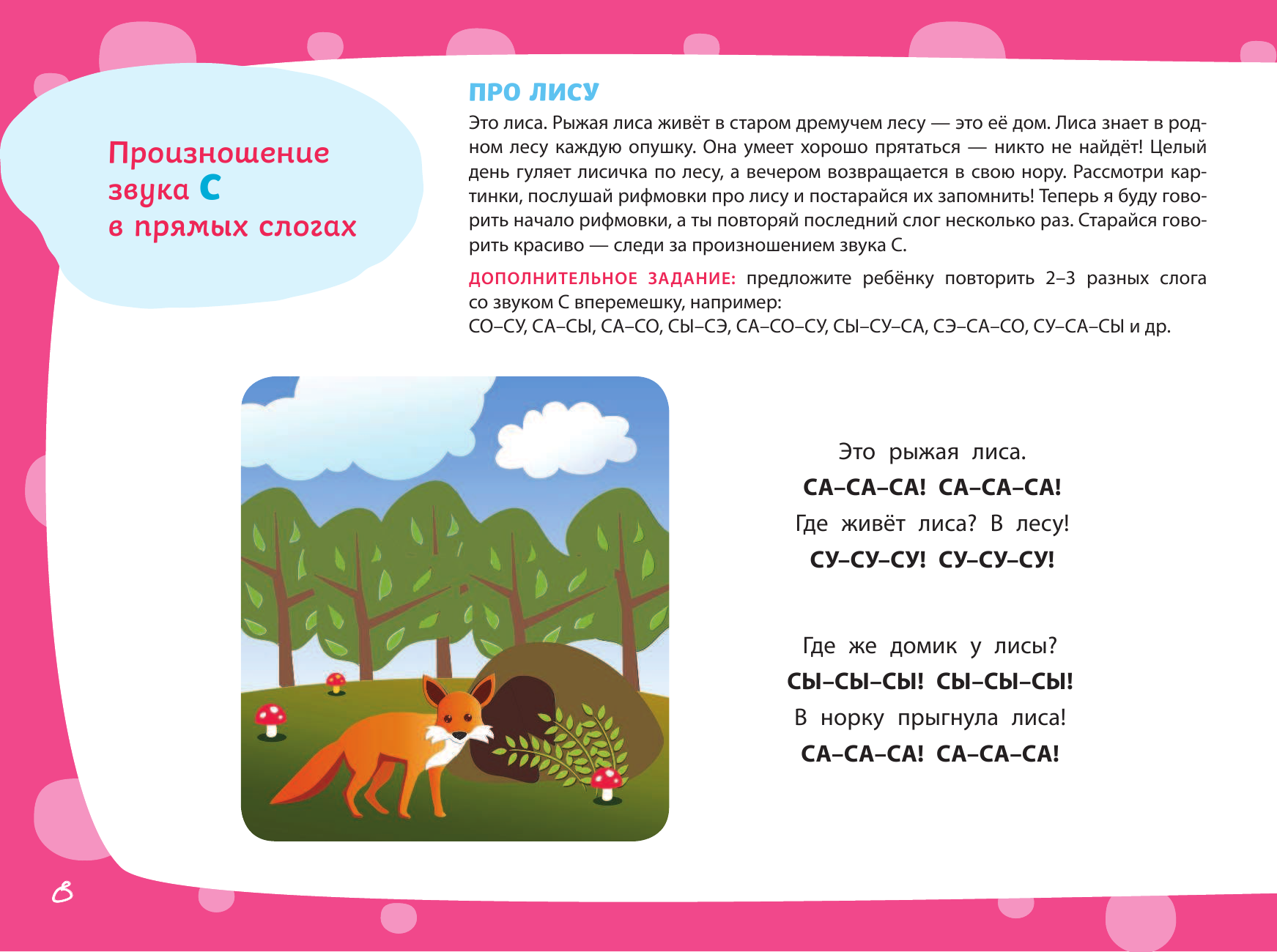- Автоматизация звука в речи. После того, как правильный звук поставлен, его необходимо ввести в речь. Для этого мы предлагаем ребёнку речевой материал разного уровня сложности для повторения — слоги (например, прямые – СА, СО, СУ, и обратные – АС, ОС, УС), слова разной степени сложности (например, СОВА, МИСКА, КОМПАС), словосочетания и предложения, стихи (рифмовки, скороговорки, чистоговорки, стишки и потешки) и рассказы. Уровень сложности предлагаемого речевого материала повышается постепенно. Этот этап можно с успехом проработать по предлагаемому альбому.