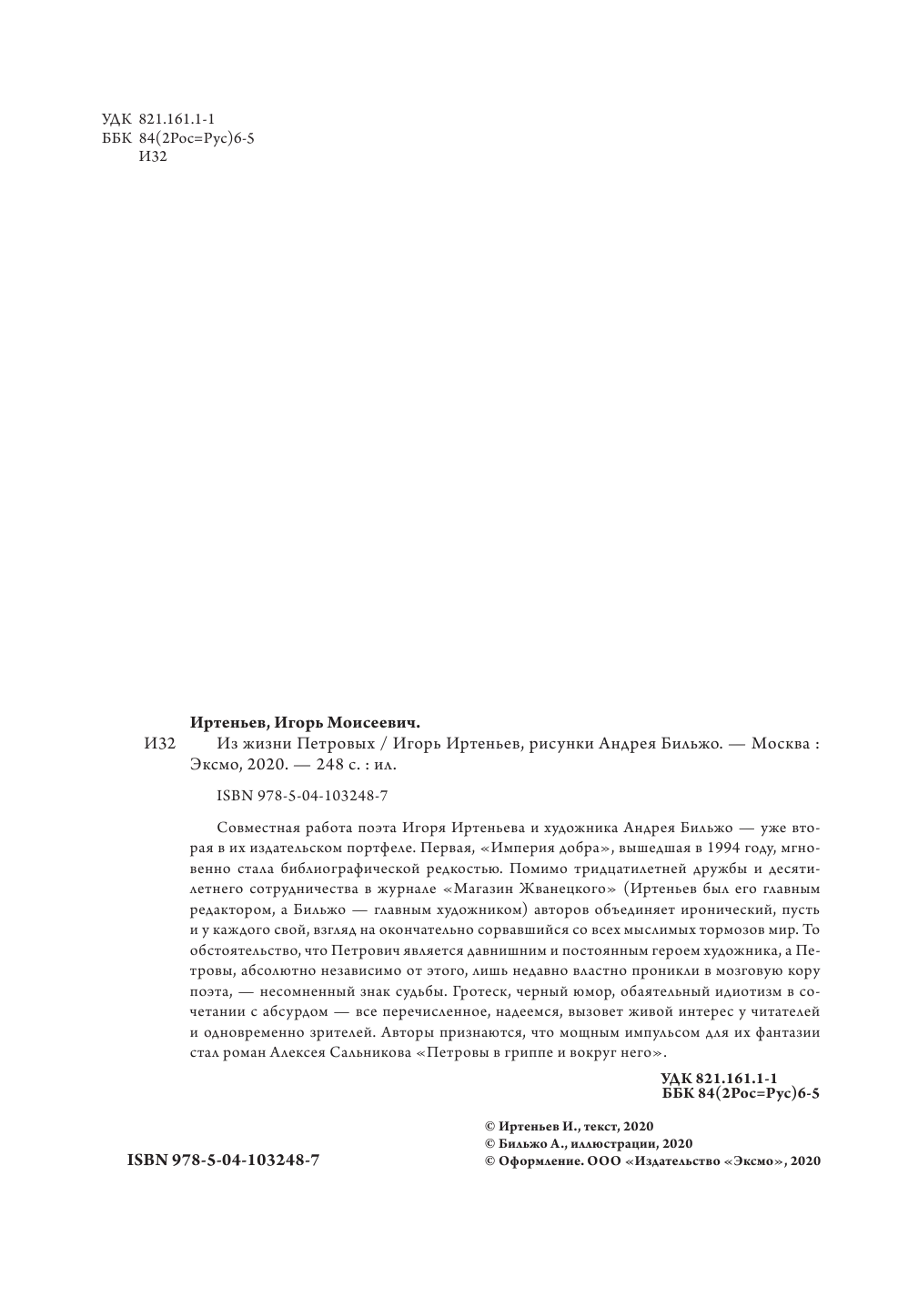 Совместная работа поэта Игоря Иртеньева и художника Андрея Бильжо — уже вторая в их издательском портфеле. Первая, "Империя добра", вышедшая в 1994 году, мгновенно стала библиографической редкостью. Помимо тридцатилетней дружбы и десятилетнего сотрудничества в журнале "Магазин Жванецкого" (Иртеньев был его главным редактором, а Бильжо главным художником — авторов объединяет иронический, пусть и у каждого свой, взгляд на окончательно сорвавшийся со всех мыслимых тормозов мир. То обстоятельство, что Петрович является давнишним и постоянным героем художника, а Петровы, абсолютно независимо от этого, лишь недавно властно проникли в мозговую кору поэта, — несомненный знак судьбы. Гротеск, черный юмор, обаятельный идиотизм в сочетании с абсурдом — все перечисленное, надеемся, вызовет живой интерес у читателей и одновременно зрителей. Авторы признаются, что мощным импульсом для их фантазии стал роман Алексея Сальникова "Петровы в гриппе и вокруг него".