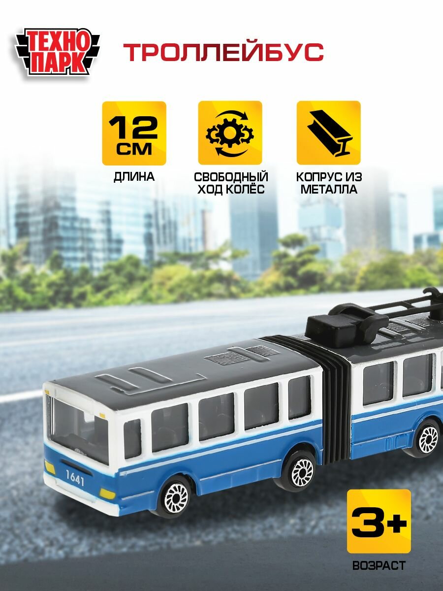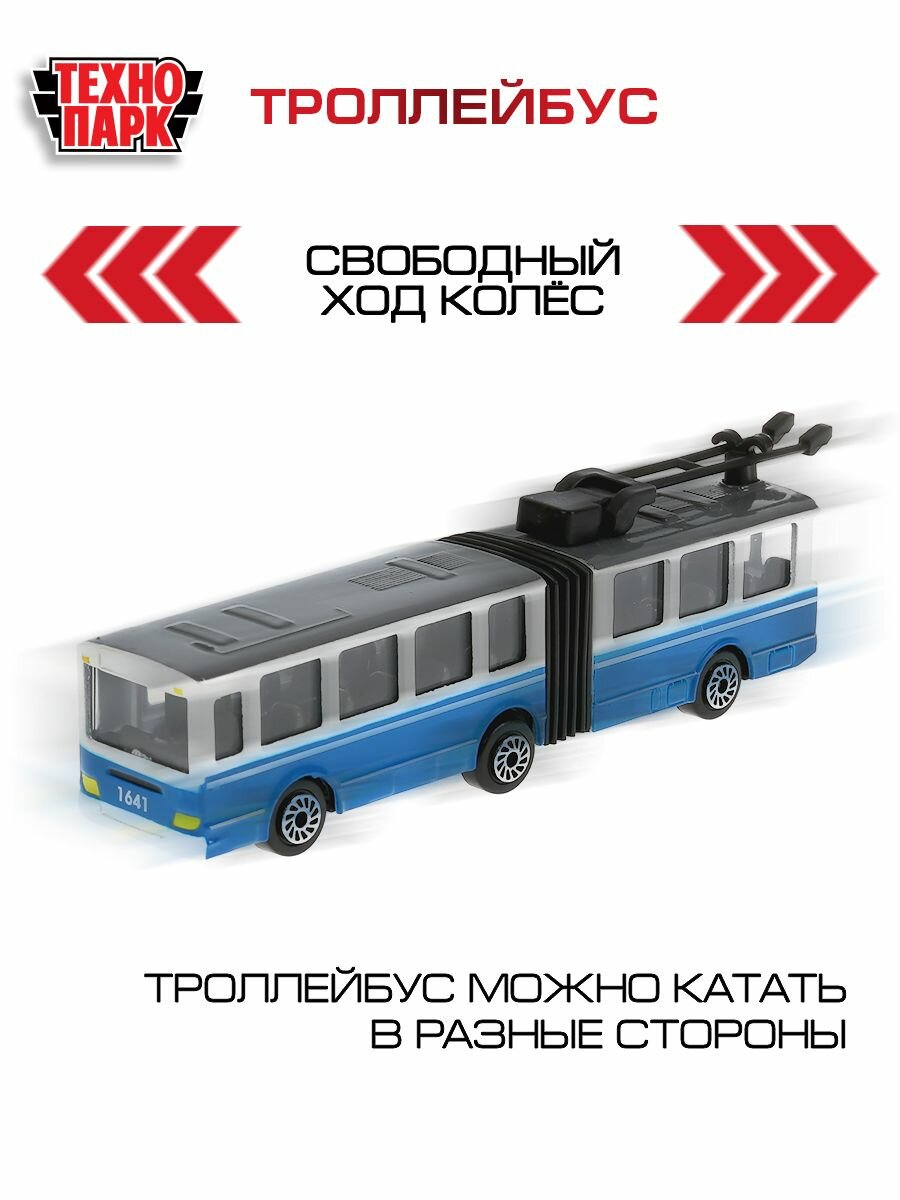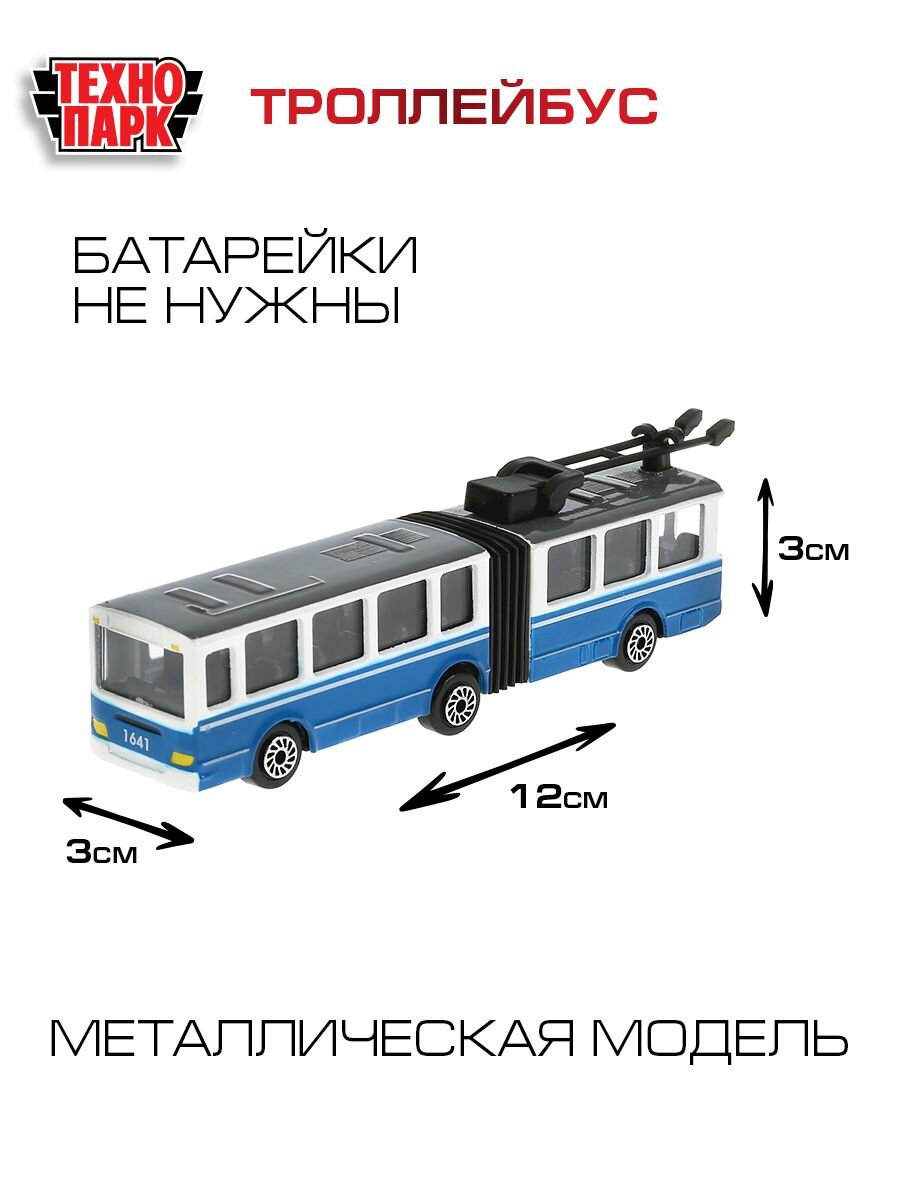 Игрушечный троллейбус от российского бренда Технопарк позволит воссоздать дорожную обстановку в городе и разнообразить сюжетно-ролевые игры. Это металлическая модель имеет реалистичный дизайн и способна двигаться благодаря инерционному механизму.Особенности:- Игрушечный транспорт подходит детям от 3-х лет.- Он исполнен в виде большого городского троллейбуса с гармошкой.- Игрушечная модель изготовлена из металла и имеет реалистичный дизайн.- Через прозрачные стекла ребенок сможет рассмотреть салон троллейбуса, опустить и поднять рога, раздвинуть и сдвинуть гармошку.- Городской транспорт движется по 15-му маршруту. Эта надпись указана над лобовым стеклом.- Колеса машины свободно вращаются, обеспечивая легкое движение.- Троллейбус снабжен инерционным механизмом. Немного потянув автомобиль назад, он с ускорением покатится вперед.- Металлический корпус обеспечивает прочность и износостойкость игрушки.- Троллейбус разнообразит сюжетно-ролевый игры и поможет развить фантазию ребенка.