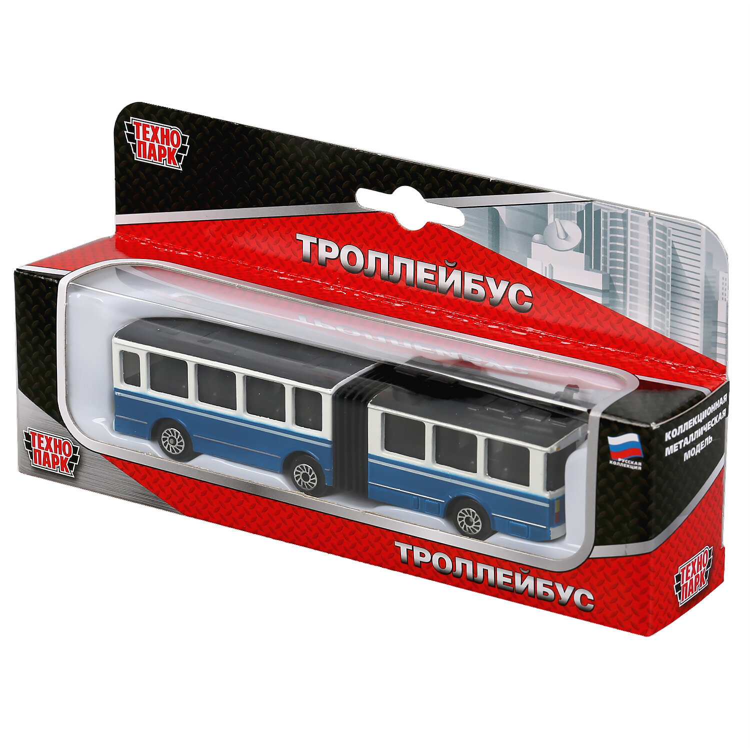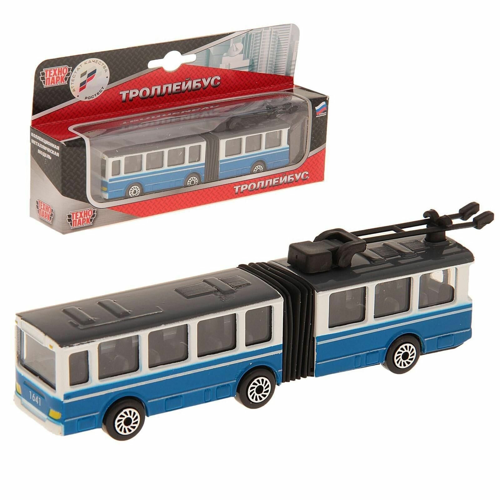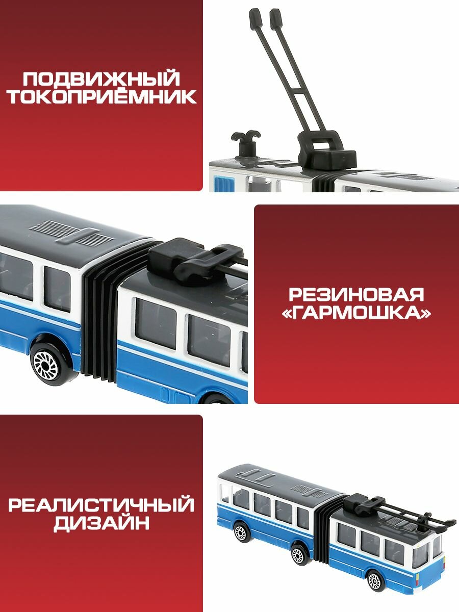Игрушечный троллейбус от российского бренда Технопарк позволит воссоздать дорожную обстановку в городе и разнообразить сюжетно-ролевые игры. Это металлическая модель имеет реалистичный дизайн и способна двигаться благодаря инерционному механизму.Особенности:- Игрушечный транспорт подходит детям от 3-х лет.- Он исполнен в виде большого городского троллейбуса с гармошкой.- Игрушечная модель изготовлена из металла и имеет реалистичный дизайн.- Через прозрачные стекла ребенок сможет рассмотреть салон троллейбуса, опустить и поднять рога, раздвинуть и сдвинуть гармошку.- Городской транспорт движется по 15-му маршруту. Эта надпись указана над лобовым стеклом.- Колеса машины свободно вращаются, обеспечивая легкое движение.- Троллейбус снабжен инерционным механизмом. Немного потянув автомобиль назад, он с ускорением покатится вперед.- Металлический корпус обеспечивает прочность и износостойкость игрушки.- Троллейбус разнообразит сюжетно-ролевый игры и поможет развить фантазию ребенка.