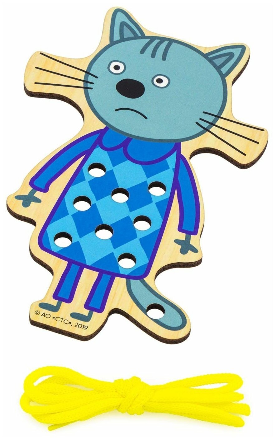 Alatoys Шнуровка Нудик Шнуровки серии "Три кота" представляют собой изображения персонажей мультфильма на деревянной панели. В игрушке есть отверстия, в которые нужно продевать шнурок. Шнурок есть в комплекте. Шнуровка - отличный тренажер для развития мелкой моторики, усидчивости и внимания. Яркие игрушки привлекут внимание ребенка. Малыш будет старательно трудиться, захватывая шнурок пальчиками и продевая его в отверстия. Работа пальчиков влияет на развитие речи ребенка. Ребенок может создать свой неповторимый рисунок шнурком на изделии. Не забывайте хвалить ребенка за все его достижения. Тренируем речь: спросите малыша, какого цвета игрушка, как зовут любимых персонажей. Сочините свою сюжетную линию мультфильма - куда сегодня отправится Изюм, и какие приключения ждут его в ваших фантазиях.