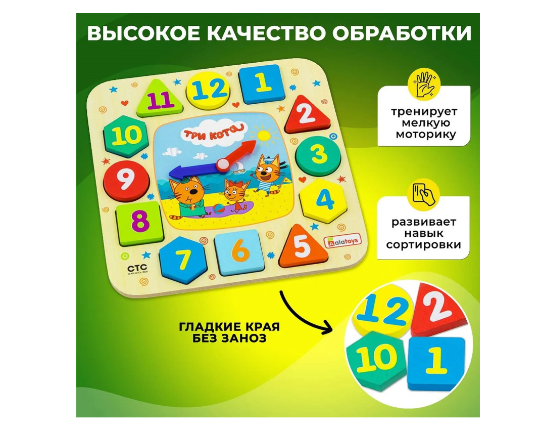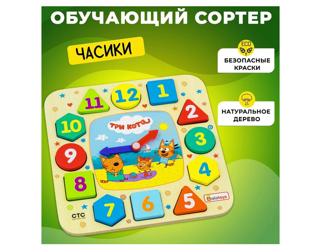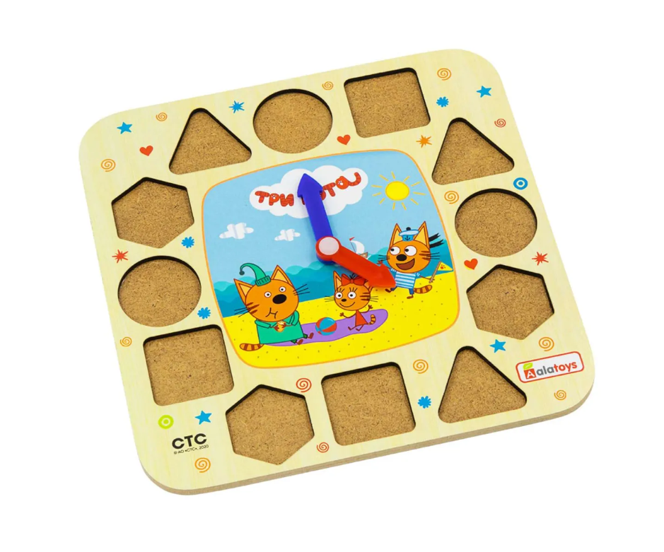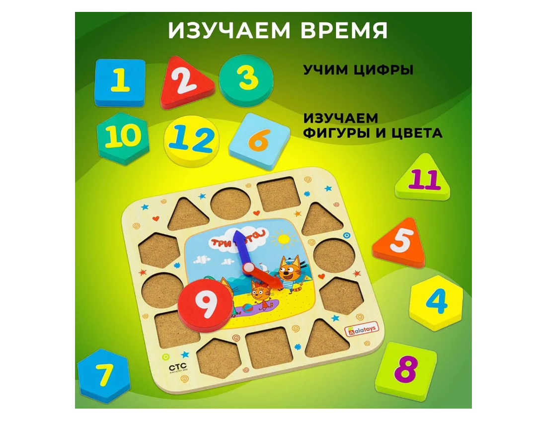 Alatoys Часики Три кота (12 деталей) Познавательная игрушка в виде циферблата часов, со стрелками и 12 цифрами- вкладышами. Она познакомит ребёнка с понятием времени, с цифрами и цветами радуги, а любимые герои сделают занятие увлекательным. А также научит самостоятельно располагать по кругу цифры и правильно выставлять время. Это полезная игрушка для развития мелкой моторики, речи и фантазии малыша. Придумайте вместе истории, что делают герои в течение дня- и ребёнку будет очень интересно изучать понятие времени! Особенности: 12 деталей. 210x210x16 мм