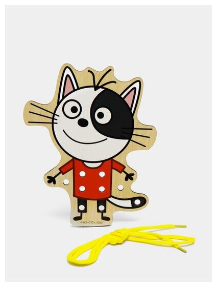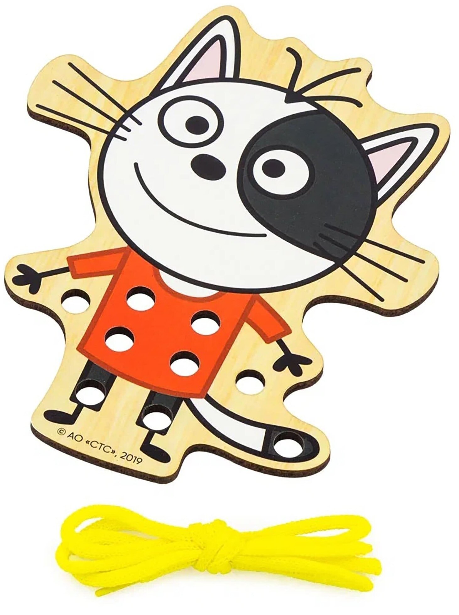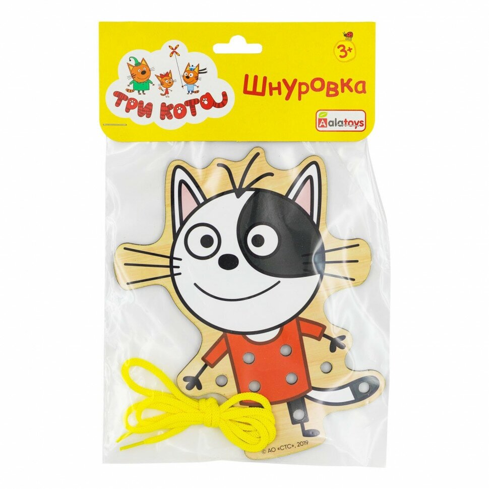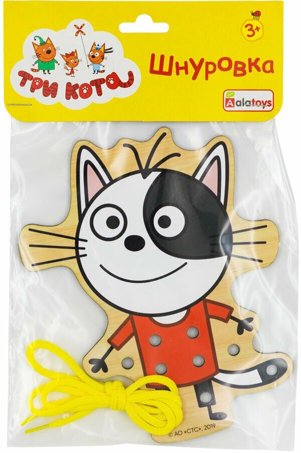 Alatoys Шнуровка Шуруп Шнуровки серии "Три кота" представляют собой изображения персонажей мультфильма на деревянной панели. В игрушке есть отверстия, в которые нужно продевать шнурок. Шнурок есть в комплекте. Шнуровка - отличный тренажер для развития мелкой моторики, усидчивости и внимания. Яркие игрушки привлекут внимание ребенка. Малыш будет старательно трудиться, захватывая шнурок пальчиками и продевая его в отверстия. Работа пальчиков влияет на развитие речи ребенка. Ребенок может создать свой неповторимый рисунок шнурком на изделии. Не забывайте хвалить ребенка за все его достижения. Тренируем речь: спросите малыша, какого цвета игрушка, как зовут любимых персонажей. Сочините свою сюжетную линию мультфильма - куда сегодня отправится Шуруп, и какие приключения ждут его в ваших фантазиях.