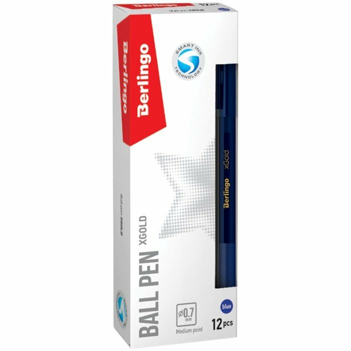 Ручка шариковая Berlingo xGold это флагманская модель ассортимента Berlingo. 12 штук в упаковке. Цвет чернил: синий. Толщина линии письма: 0,5 мм. Длина письма: 850 м. Не раз становилась официальной ручкой Тотального диктанта ежегодной образовательной акции популяризации грамотности. Кроме того, xGold является обладателем премии Выбор канцелярского рынка 2018. Ручка оснащена вентилируемым колпачком, который обеспечивает безопасность при использовании детьми. Удобный пластиковый клип позволяет закрепить ручку, например, на ежедневнике или тетради. Мягкий резиновый грип препятствует скольжению пальцев и обеспечивает комфортное письмо. Диаметр пишущего узла составляет 0,7 мм, благодаря чему ручка прекрасно подходит для любого стиля письма. Уникальная запатентованная технология Smart Ink обеспечивает лёгкое и приятное письмо за счёт использования чернил пониженной вязкости, специальной конструкции пишущего узла и инновационных материалов шарика и пишущего узла. Инновационные компоненты, используемые для изготовления шарика пишущего узла (карбид вольфрама), обеспечивают долговечность и стабильность качества письма.