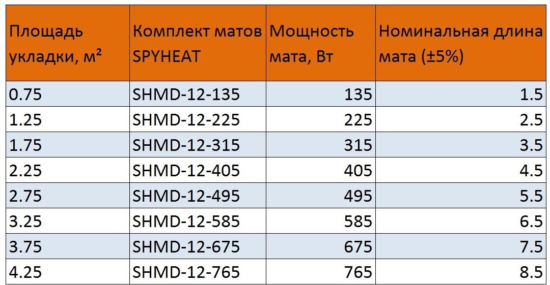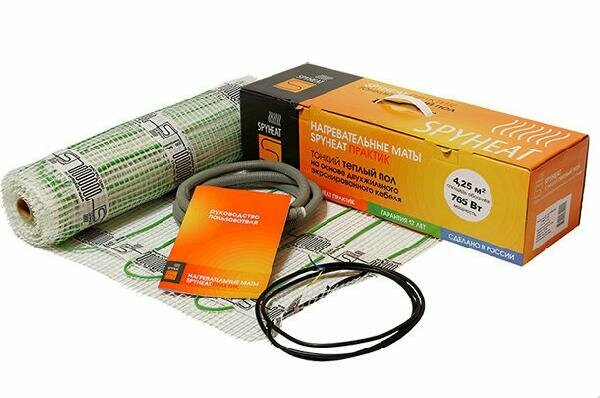 Нагревательные маты тёплого пола «SPYHEAT: Практик» - это мат с кабелем повышенной мощности сечением 4мм и тепловыделением 180 Вт/м для максимально эффективного обогрева особо холодных помещений либо для территорий с прохладным климатом. Прекрасно подходят для укладки в тонкую стяжку либо плиточный клей. При использовании нагревательных матов для комфортного подогрева пола в качестве финишного покрытия могут использоваться любые материалы с высокой теплопроводностью, такие как керамическая плитка, натуральный или искусственный камень и т. д.Нагревательные маты SPYHEAT Практик мощностью 180 Вт/м² представляют собой тонкий двухжильных экранированный нагревательный кабель, закрепленный с фиксированным шагом на теплостойкой стеклосетке шириной 50 см.Уникальный нагревательный двухжильный кабель с фторопластовой изоляцией и экраном SPYHEAT обеспечивает надежность системы, быстрый и равномерный прогрев, заземление, техническую безопасность и экологичность.Применяются в тех случаях, когда у Вас нет возможности поднимать существующий уровень пола или Вы не планируете делать толстую стяжку, а так же если Вы хотите максимально сократить сроки монтажных работ. Для удобства потребителей и торгующих организаций наборы комплектуются всем необходимым и упаковываются в фирменные коробки: мат теплого пола, гофротрубка с заглушкой.Удельное тепловыделение кабельной секции составляет 12 Вт/м, диаметр кабеля - 4 мм.Для выбора необходимого комплекта нагревательных матов необходимо удельную мощность мата, 180 Вт/м2, умножить на "чистую" площадь помещения. Чистая площадь - это площадь, не занятая стационарной мебелью и оборудованием. Для того чтобы определить "чистую" площадь от линейных размеров комнаты отнимите по 5-10 сантиметров отступа со стороны всех стен и перегородок. От площади, вычисленной по этим размерам, отнимите площадь, занятую мебелью. Полученная величина будет составлять "чистую" площадь помещения.Зная необходимую мощность, выберите ближайший по мощности набор нагревательных матов равный необходимой мощности или меньший. Помните, что ширина мата составляет - 0.5 метра.