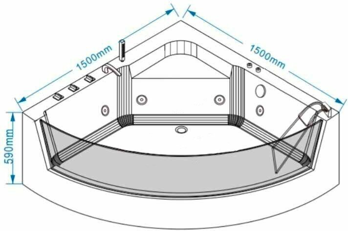 Ванна из 100% акрила. Размер: 1500х1500х590мм. Толщина покрытия 5мм. Антискользящее покрытие. Антибактериальное покрытие. Усиленный каркас. Четырехслойная армировка. Озонотерапия. Гидромассаж 4 шт. Аэромассаж 10 шт. Пульт управления. Водозаборник. Смеситель 3х местный. Ручной душ. Подголовник 1 шт. Хромотерапия. Датчик сухого пуска. Клапан слива. Регулятор воздуха. Ручка перелива. FM-радио;Двигатель гидро 0,75кВт. Двигатель аэро 0,2 кВт. LED подстветка.