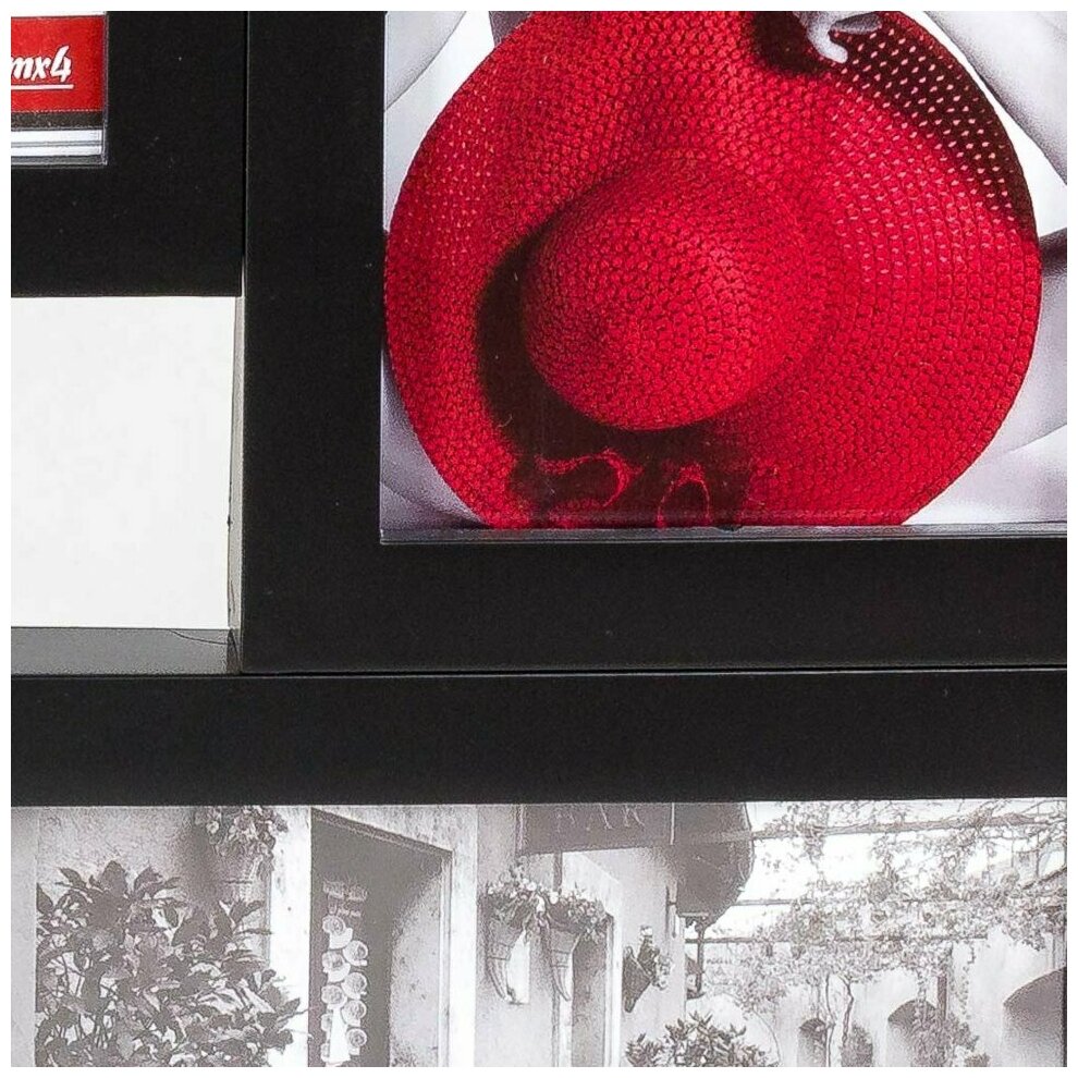 Фоторамка-коллаж "Image Art" выполнена из пластика черного цвета и защищена стеклом, предназначена для четырех фотографий с вертикальным и горизонтальным расположением. Фоторамка вешается на стену, для чего с задней стороны предусмотрены специальные петельки.