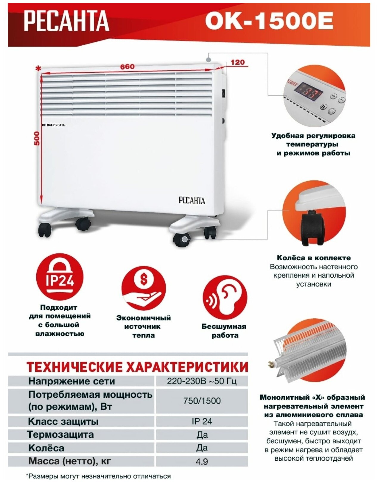 Электрический конвектор Ресанта – это первоклассное отопительное оборудование со встроенным электронным термостатом и цифровым дисплеем. Конвектор представлен в плоском металлическом корпусе и укомплектован ножками для напольного размещения и набором настенного крепления. Модель имеет высокий уровень безопасности и может монтироваться во влажных помещениях.