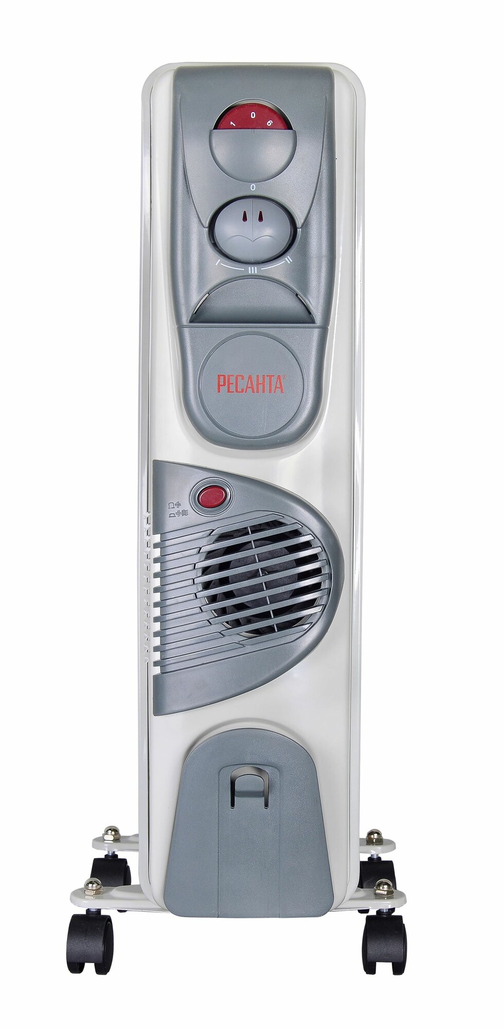 Масляный радиатор Ресанта – это отличный выпор для домашнего использования. Металлическая конструкция герметична и оснащена ручкой и роликами для перемещения по квартире. Отличительной особенностью радиатора является наличие встроенного вентилятора, задача которого ускорить распределение тепла по всему объему помещения.
