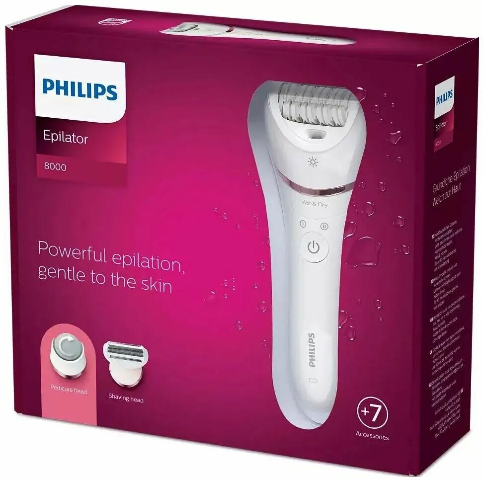 | Прочие особенности и свойства | Эпиляторы Philips Series 8000 — это эффективная и одновременно бережная эпиляция за счет усовершенствованной системы эпиляции, обеспечивающей более 70 000 захватов волосков в минуту. Это означает, что вы можете обработать большую поверхность за одно движение и добиться безупречной гладкости на срок до 4 недель. На голени у вас уйдет всего 10 минут! |