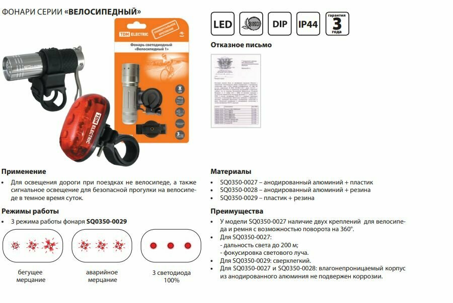 Сервис сравнения цен СкидкаГИД предлагает сравнить цены на товар «Фонарь для велосипеда TDM SQ0350-0029»
