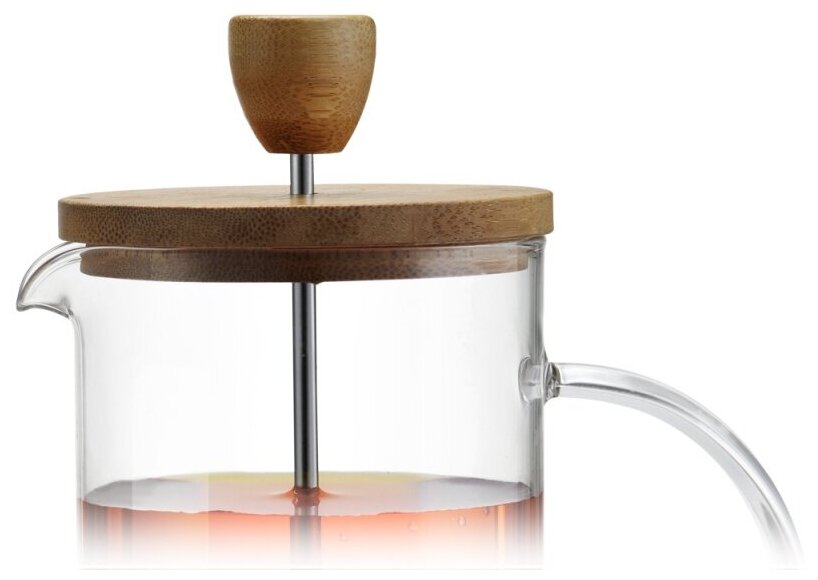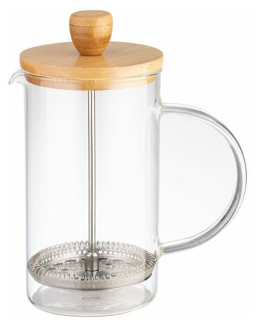 Кажется хрупким, но очень элегантно смотрится! Дерево добавляет уюта, экологично. Хороший френч-пресс. Горячее молоко взбивает на ура. Кипяток не заливала, страшно, что стекло тонкое, хотя не должен треснуть.