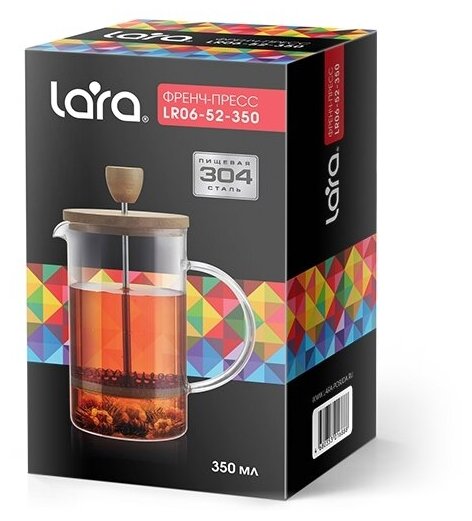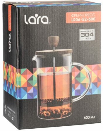 Практичный и стильный дизайн френч-пресса Lara LR06-52 порадует за чаепитием не только вас, но и ваших гостей. Он изготовлен из высококачественной нержавеющей стали и термостойкого стекла, устойчивого к резкому перепаду температур. Форма носика идеальна для наливания напитков и препятствует образованию подтеков, а оригинальный внешний вид изделия украсит интерьер современной кухни. Пресс-фильтр с уплотнительным кольцом из нержавеющей стали. Благодаря прозрачным стенкам вы сможете определить крепость заваренного напитка. Стильная бамбуковая крышка. Модель представлена в нескольких объемах: 350, 600 мл. Френч-пресс упакован в подарочную коробку.