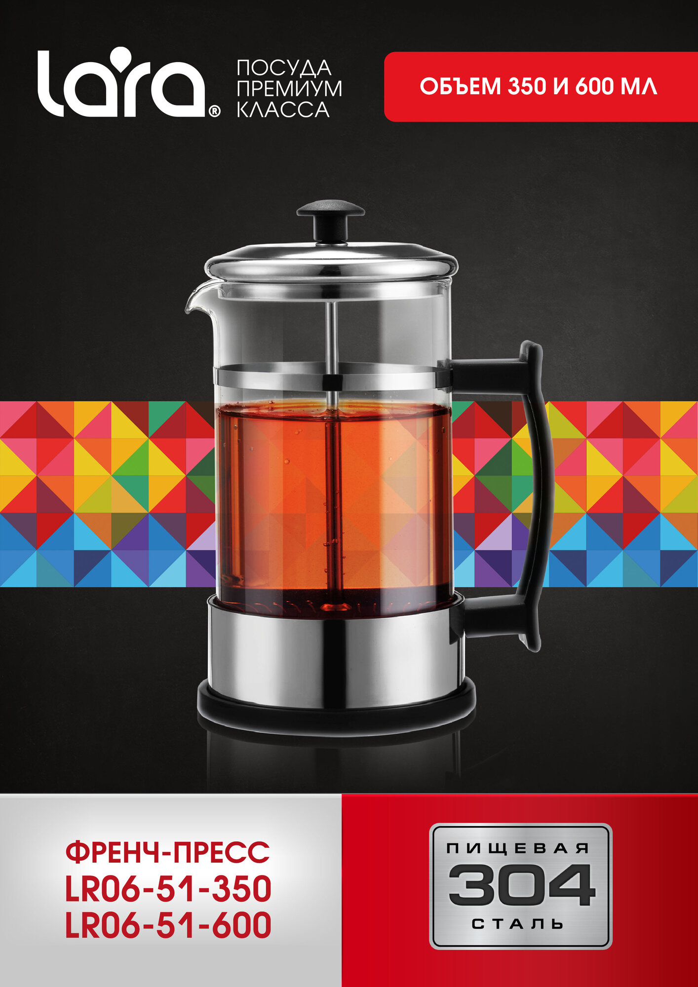 Практичный и стильный дизайн френч-пресса Lara LR06-51 порадует за чаепитием не только вас, но и ваших гостей. Он изготовлен из высококачественной нержавеющей стали и термостойкого стекла, устойчивого к резкому перепаду температур. Форма носика идеальна для наливания напитков и препятствует образованию подтеков, а оригинальный внешний вид изделия украсит интерьер современной кухни. Пресс-фильтр из нержавеющей стали с уплотнительным кольцом. Благодаря прозрачным стенкам вы сможете определить крепость заваренного напитка. Кроме того, данная модель оснащена ненагревающейся ручкой, что обеспечивает удобство и безопасность использования. Модель представлена в нескольких объемах: 350, 600 мл. Можно мыть в посудомоечной машине. Френч-пресс упакован в подарочную коробку.
