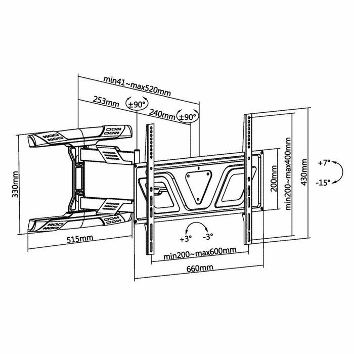 Наклонно-поворотный кронштейн для телевизора ULTRAMOUNTS UM910. Диагональ экрана: 37-75. VESA: 200x200, 300X200, 300X300, 400x200, 400X300, 400x400, 600x400. Максимальная нагрузка: 35 кг. Расстояние от стены: 41~520 мм. Угол поворота: +90°?-90°. Угол наклона: +7°?-15°. Регулировка уровня: +3°~-3°. Материал: холоднокатаная сталь. Протестировано с весом, превышающим заявленный максимальный в 2 раза. Движение по нескольким осям обеспечивает максимальную гибкость - можно наклонять и поворачивать телевизор для удобного просмотра с любого места в комнате.Регулировка уровня после установки обеспечивает идеальное расположение телевизора на стене. Кабель-канал поможет навести порядок в проводах, подключенных к телевизору.
