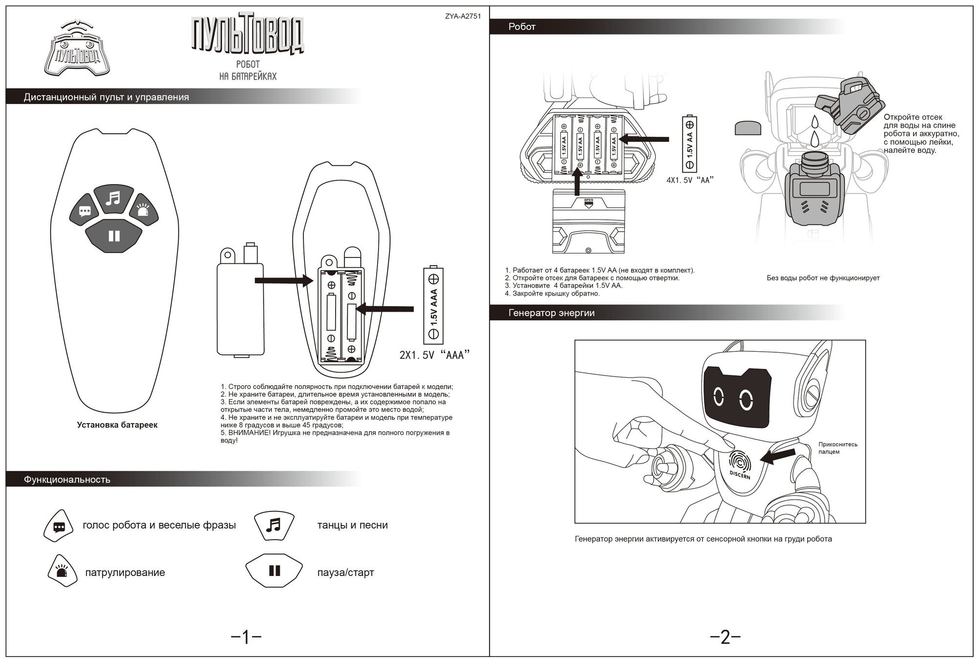 Для работы пульта необходимы 2 батарейки типа AAA, для самого робота - 4 батарейки типа AA (все батарейки не входят в комплект).
