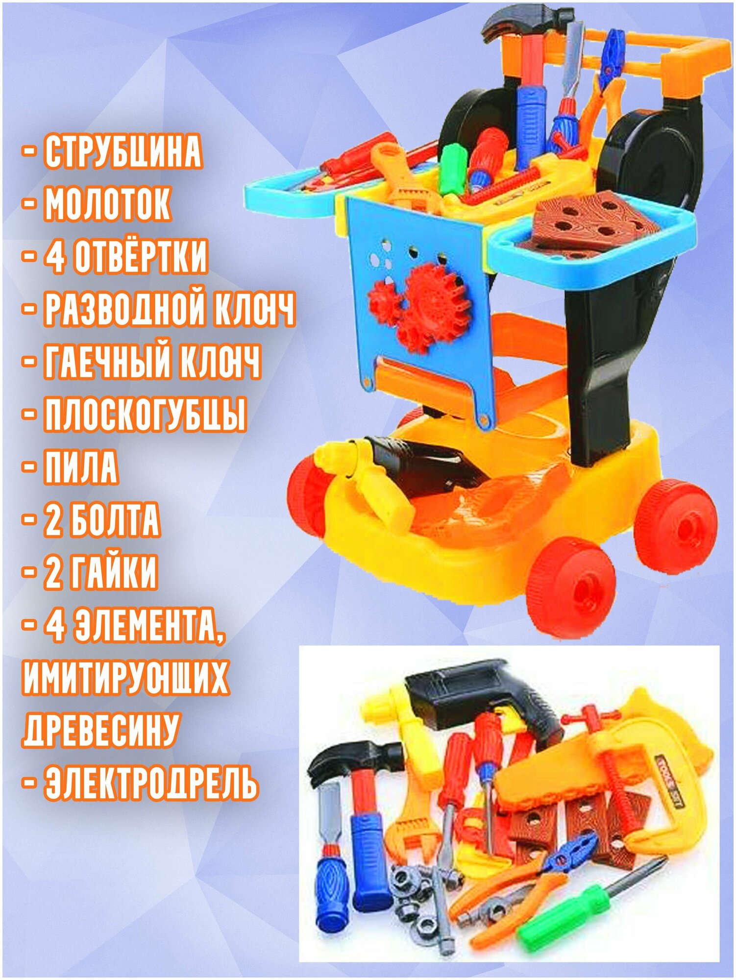 В составе набора: 1 струбцина, 1 молоток, 4 отвёртки, 1 разводной ключ, 1 гаечный ключ, 1 плоскогубцы, 1 пила, 2 болта, 2 гайки, 4 элемента, имитирующих древесину, и 1 электродрель.