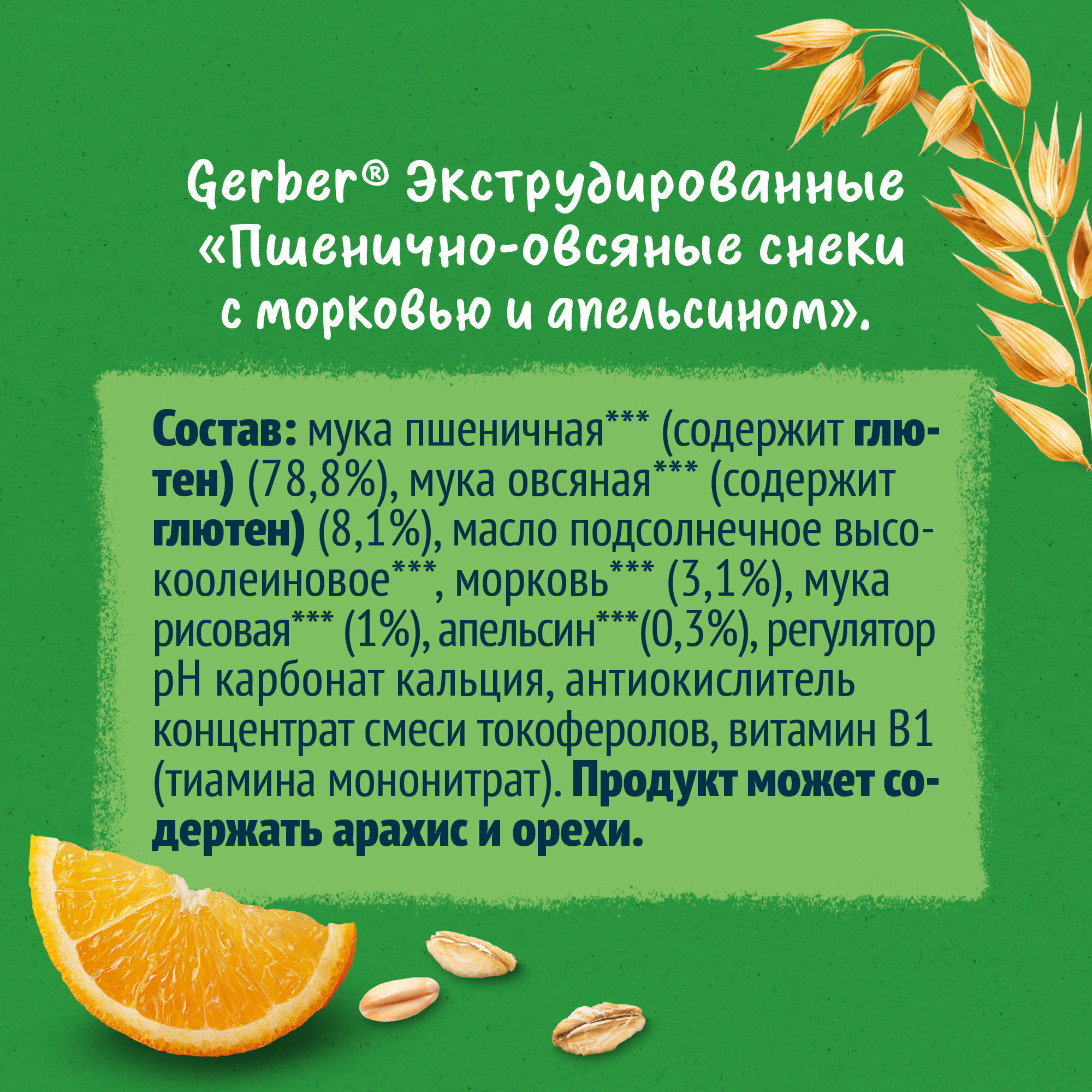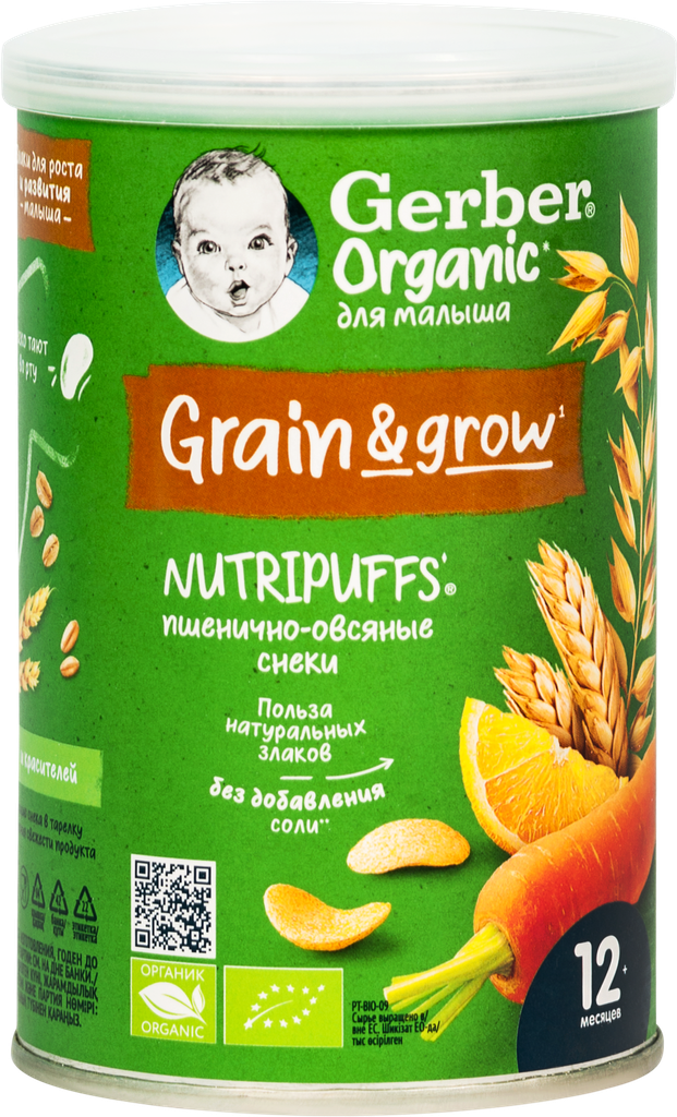 Пшенично-овсяные снеки с морковью и апельсином это цельные злаки, овощи и фрукты в одном продукте. Это полезный перекус, который тают во рту. Это продукт, который разработан специально для малышей с учетом их возрастных потребностей! Зачастую во время перекусов малыши хотят получить что-нибудь вкусненькое, и раньше это могло стать проблемой для сторонников здорового питания. Но не теперь, когда у вас есть пшенично-овсяные снеки Гербер с морковью и апельсином полезный органический продукт, без добавленной соли и сахара, который малыши уплетают за обе щеки! Разработаны специально для малышей с учетом их возрастных потребностей. Содержит цельные злаки и овощи. Помогают освоить навыки самостоятельного питания. Легко тают во рту. Удобный размер для детских пальчиков. Без искусственных красителей, консервантов, ароматизаторов и ГМО. Баночка с крышкой, чтобы продукт долго сохранял свежесть Пшенично-овсяные снеки Gerber Nutripuffs серии Organic с морковью и апельсином для детей с 12 месяцев.
