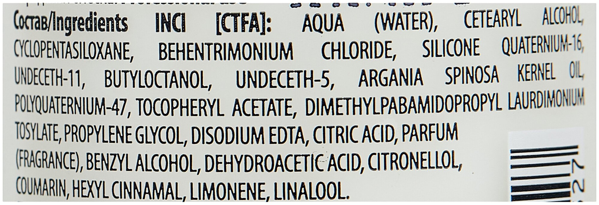 | Состав | Water, Cetearyl Alcohol, Cyclopentasiloxane, Behentrimonium Chloride, Silicone Quaternium-16, Undeceth-11, Butyloctanol, Undeceth-5, Argania Spinosa Kernel Oil, Polyquaternium-47, Tocopheryl Acetate, Dimethylpabamidopropyl Laurdimonium Tosylate, Propylene Glycol, Disodium EDTA, Citric Acid, Parfum, Benzyl Alcohol, Dehydroacetic Acid, Citronellol, Coumarin, Hexyl Cinnamal, Limonene, Linalool |