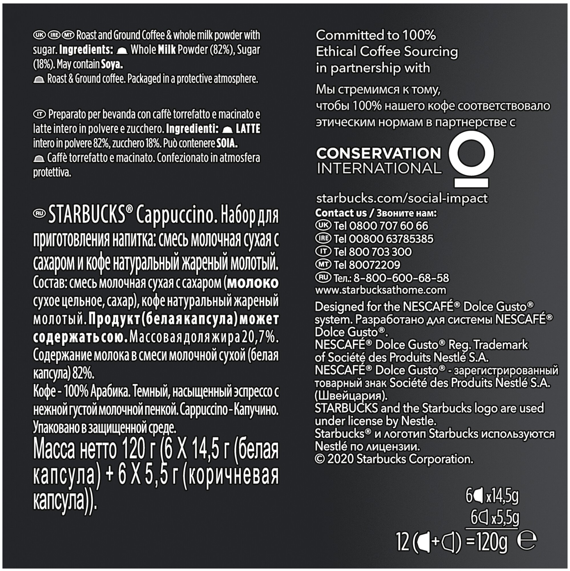 Состав: смесь молочная сухая с сахаром (молоко сухое цельное, сахар), кофе натуральный жареный молотый, продукт (белая капсула) может содержать сою, массовая доля жира 20.7%, содержание молока в смеси молочной сухой (белая капсула) 82%