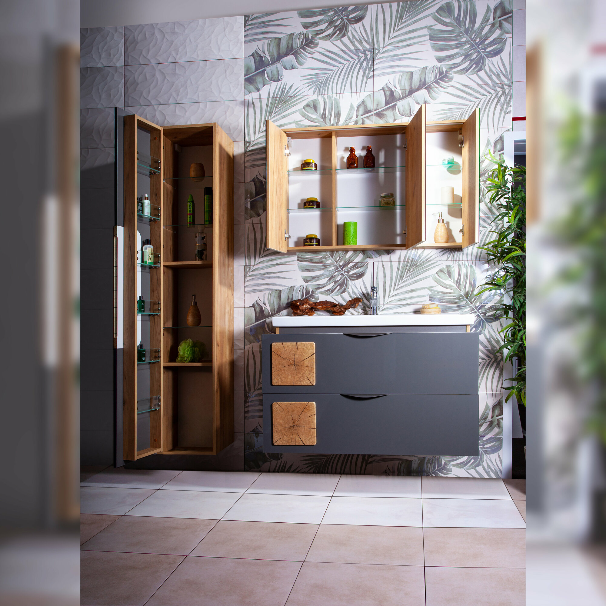 Зеркальный шкаф Бриклаер Форест 100 с подсветкой Антрацит со вставкой Пенёк