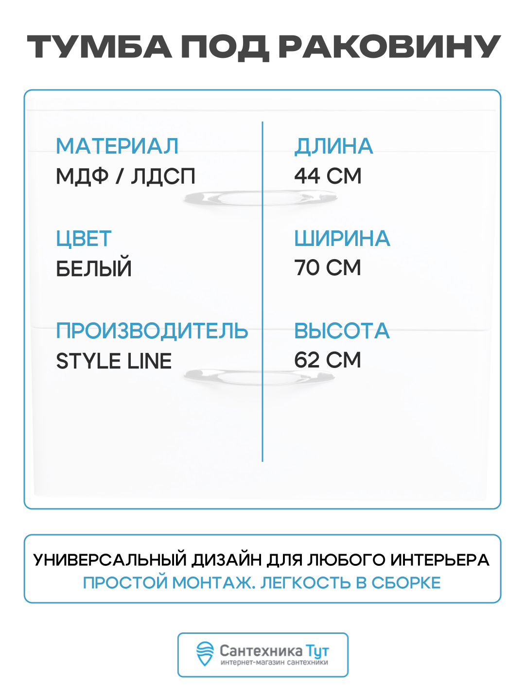 Отдельно приобретаются: раковина (в зависимости от размера тумбы), зеркальный шкаф (по ширине тумбы, оборудован удобными и вместительными полочками), колонна Style Line Каре шириной 30 сантиметров с корзиной для белья.