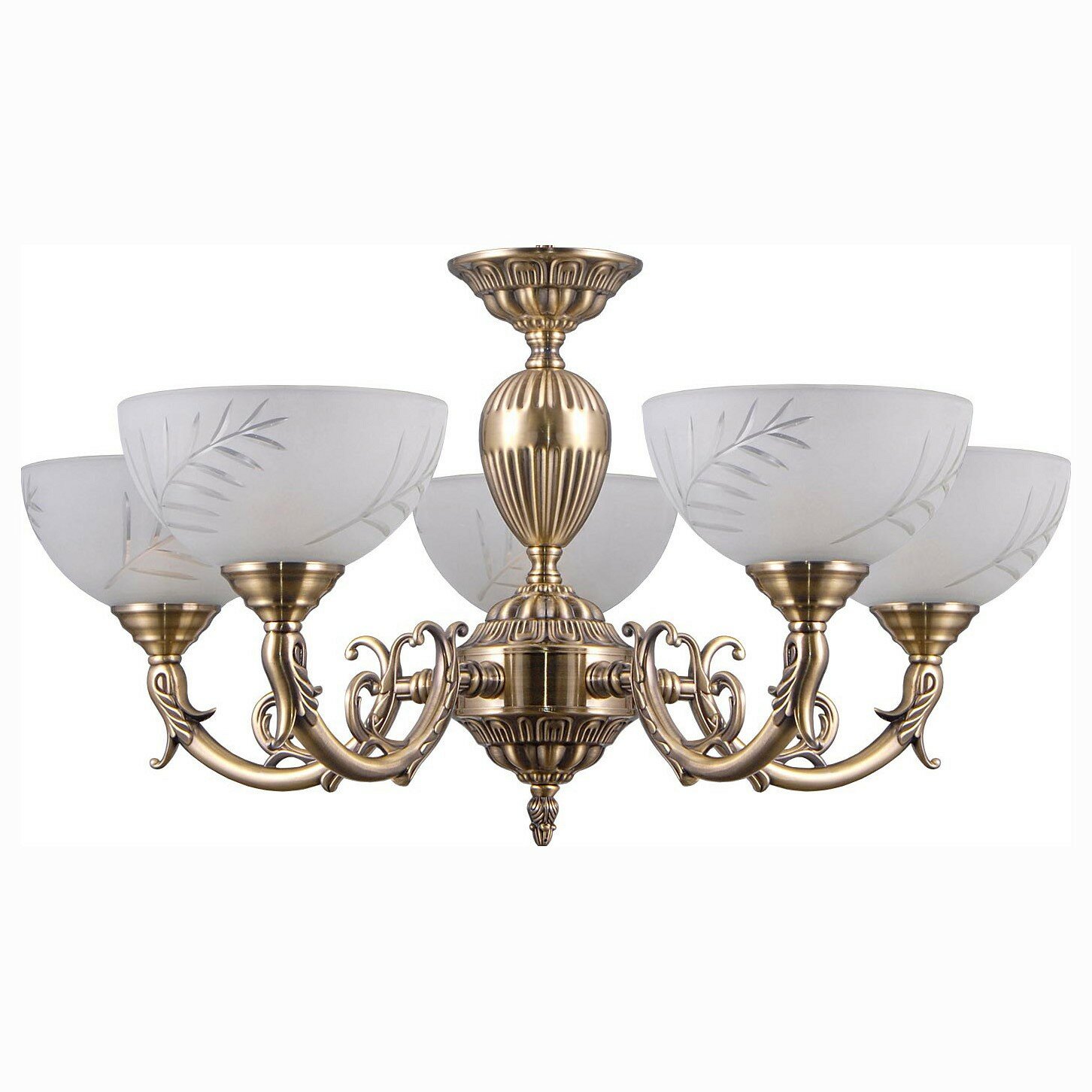 В эффектной классической люстре каждый элемент продуман с необыкновенной тщательностью. Металлическое основание привлекает внимание изысканным рельефным декором и благородным цветом античной бронзы. Изящные рожки украшены причудливыми завитками. Плафоны, выполненные из матированного стекла, своими очертаниями напоминают чаши. Их поверхность украшена прозрачным растительным узором. Направленные вверх лампы создают мягкое, комфортное рассеянное освещение без резких теней.