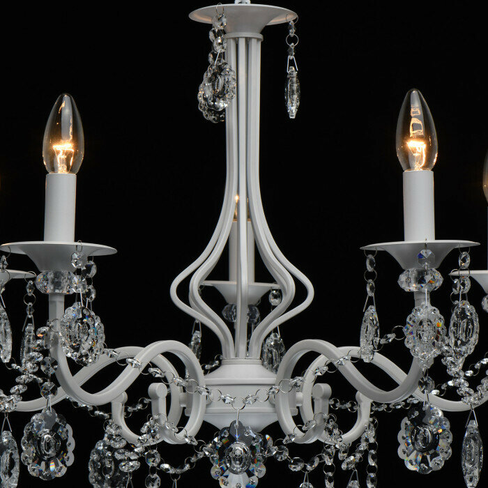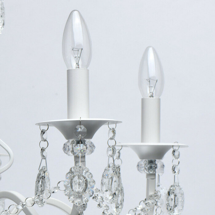 Великолепная люстра Свеча придаст классическому интерьеру праздничное, торжественное звучание. Основание изделия выполнено из металла, окрашенного в свежий белый цвет. Грациозно изогнутые рожки с изящными декоративными розетками украшены крупными кристаллами сложной огранки. Хрустальные подвесы с резным узором внутри и цепочки из прозрачных бусин создают великолепную игру света, добавляя модели шарма. Лампы в форме свечи или свечи на ветру гармонично завершат композицию.