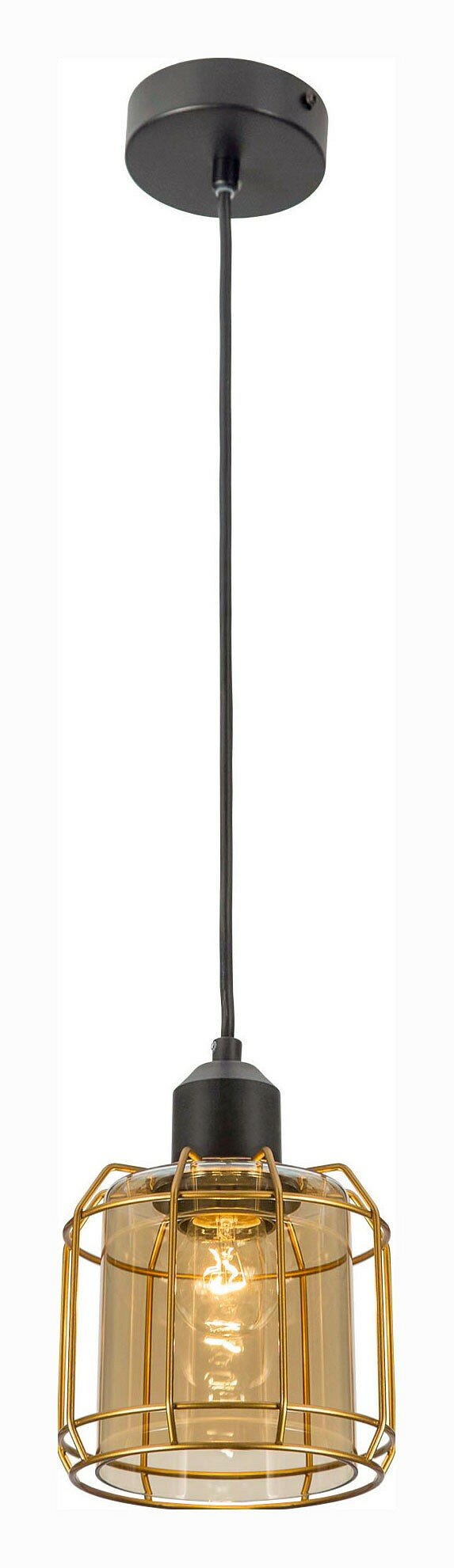 Подвесной светильник Таверна будет прекрасно смотреться как в лофт-пространстве, так и в помещении, оформленном в стиле модерн или эклектика. Основание модели выполнено из металла, окрашенного в глубокий черный цвет. Стеклянный плафон янтарного оттенка окружен прочной решеткой с бронзовым гальваническим покрытием. Использование в качестве источника света ретро-лампы Эдисона или лампы с эффектом живого пламени поможет создать аутентичное освещение, подчеркивающее характер интерьера.