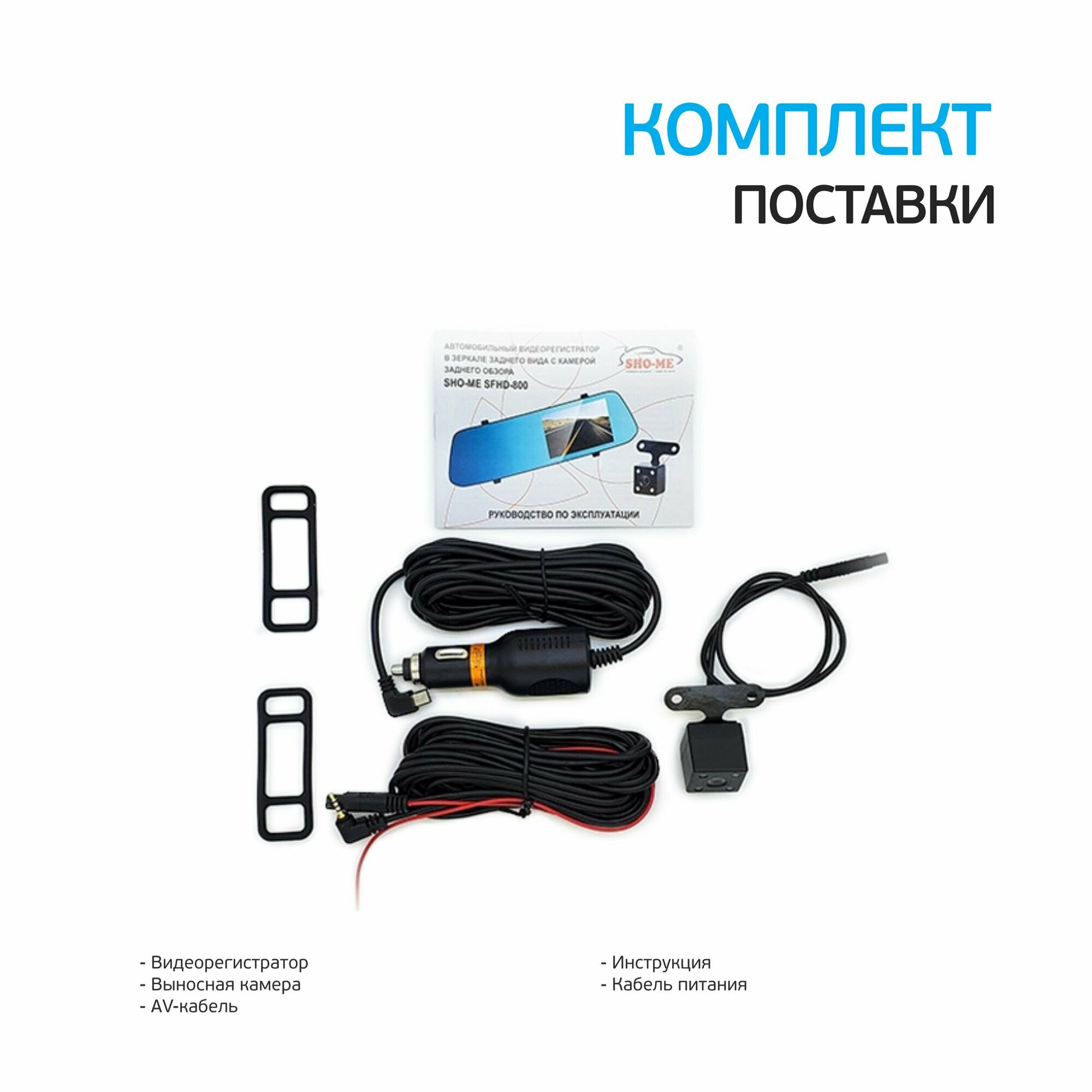 | Дополнительно в комплекте | Камера заднего вида с кабелем, установочный комплект, эластичные стяжки, адаптер питания, руководство по эксплуатации. |